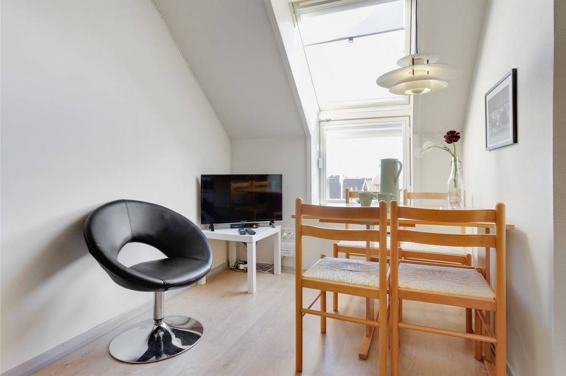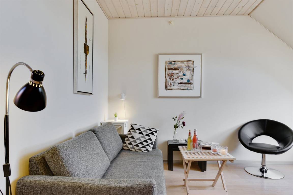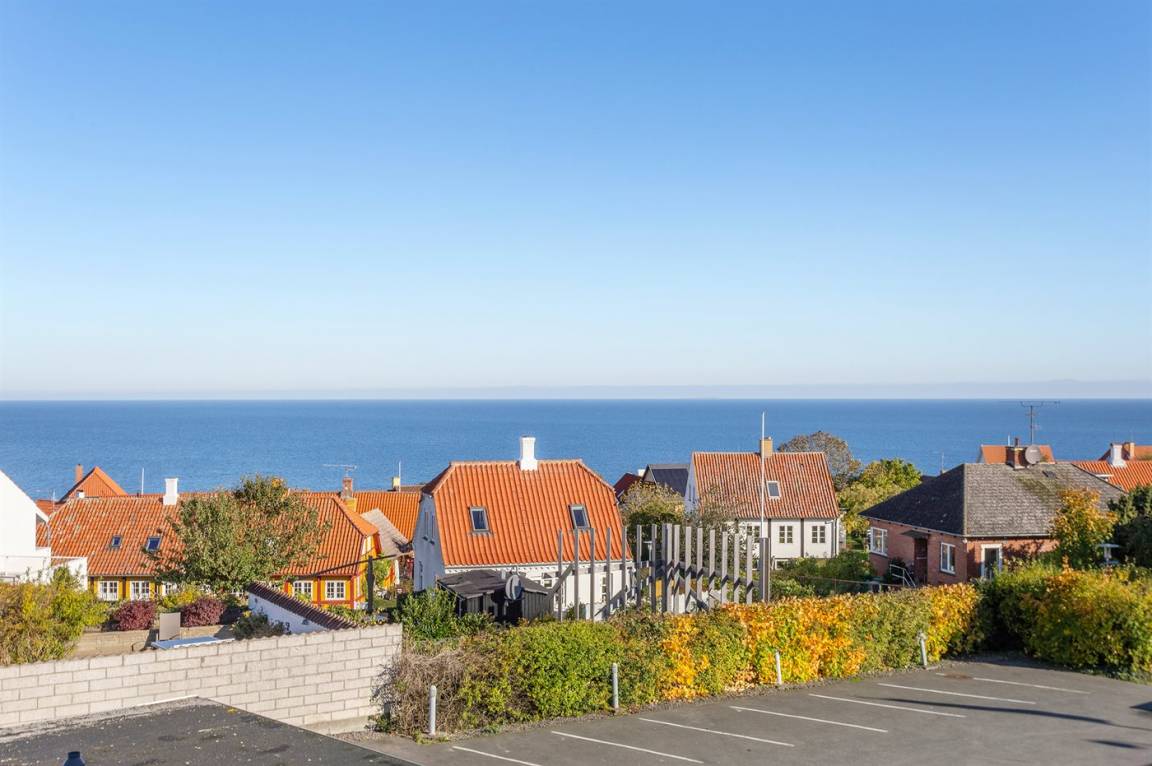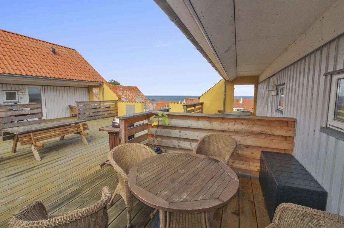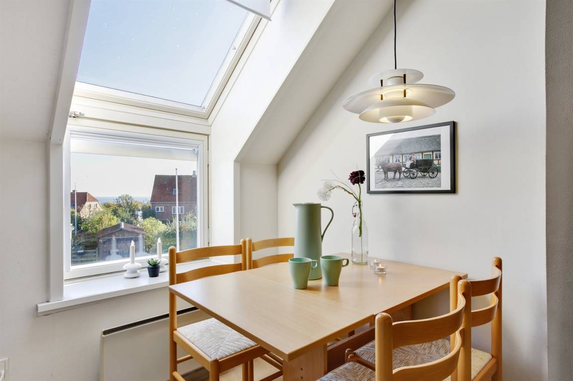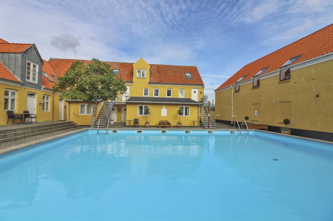 Eine kleine, jedoch gut eingerichtete Ferienwohnung im Obergeschoss mit eigener Terrasse und Zugang zur großen, gemeinschaftlichen Holzterrasse, von wo aus Sie den absolut schönsten Blick über die Dächer der Stadt und den Panoramablick auf die Ostsee genießen können. Im gefliesten Innenhof des Købmandsgården befindet sich ein großer Außenpool. Der Pool ist nicht beheizt und ist vom 1. Juni bis 30. September geöffnet.