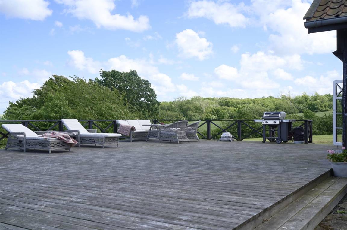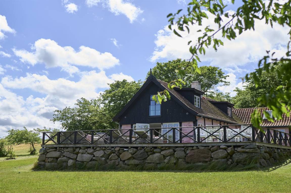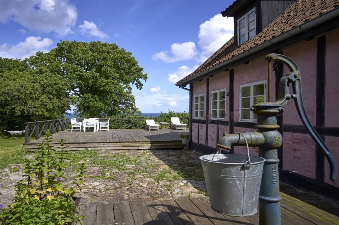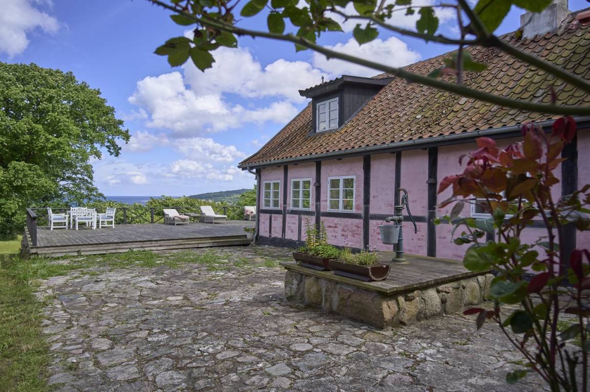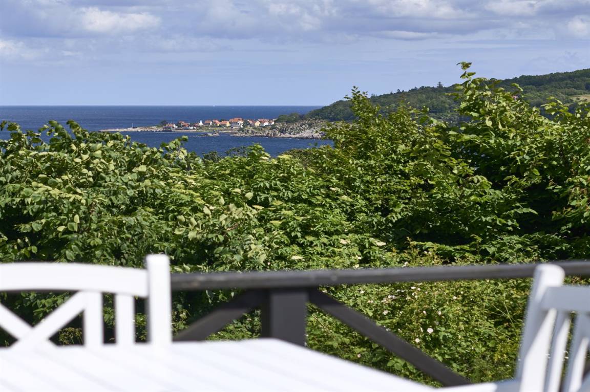 Vom Wohnzimmer aus gibt es direkten Zugang zu einer wirklich großen Terrasse. Hier findet man sowohl Essmöbel, Loungemöbel, Sonnenliegen und einen Gasgrill. Es gibt insgesamt drei Terrassen, alle mit Meerblick. Das Grundstück umfasst 3 Hektar und erstreckt sich rund um das Haus bis zu den Klippen und ans Meer, auf der anderen Seite der Landstraße. 250 m vom Haus entfernt findet man den schönen Klippenpfad zwischen Gudhjem und Helligdommen. Im Garten gibt es eine große Lagerfeuerstelle, eine Hängematte und viel Platz. Es gibt gute Parkmöglichkeiten am Haus.