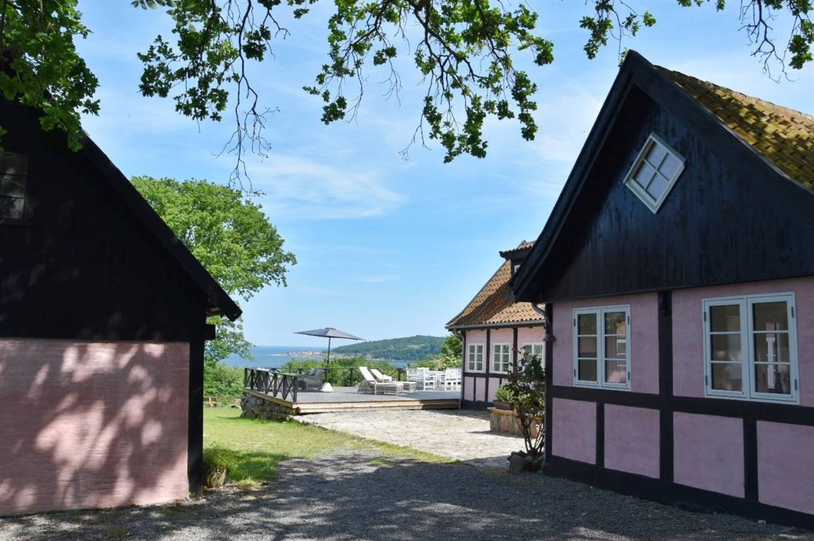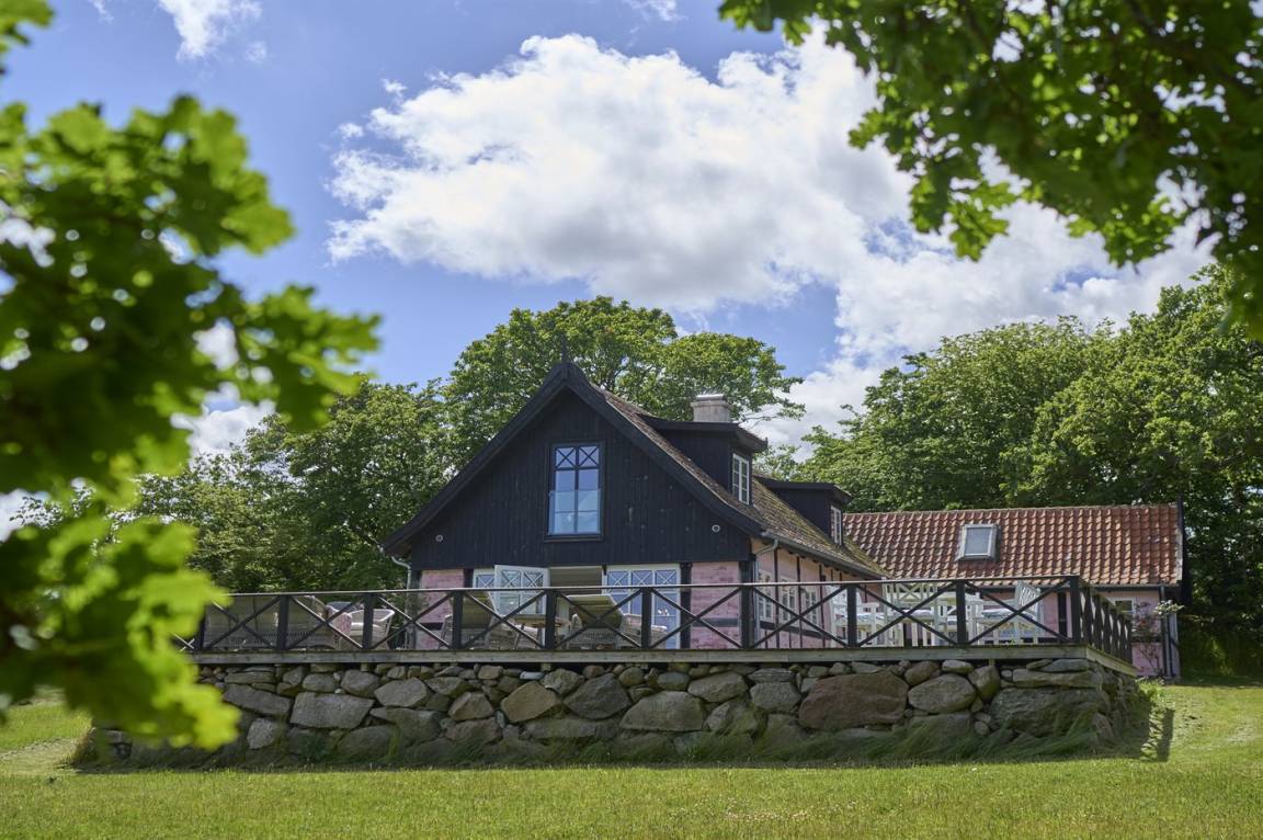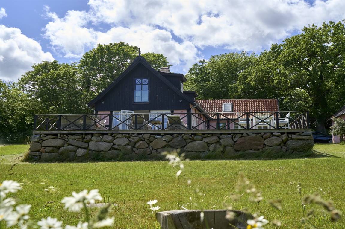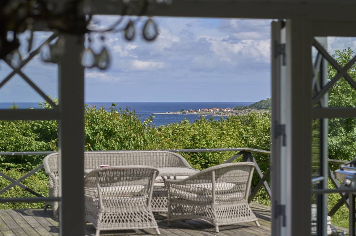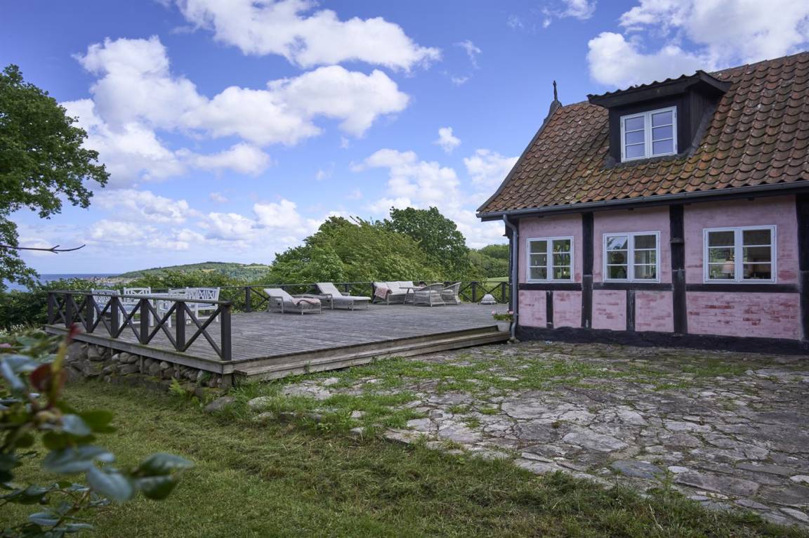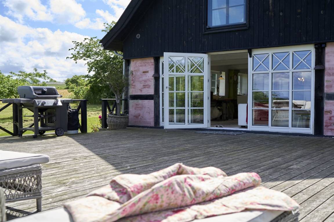 Vom Wohnzimmer aus gibt es direkten Zugang zu einer wirklich großen Terrasse. Hier findet man sowohl Essmöbel, Loungemöbel, Sonnenliegen und einen Gasgrill. Es gibt insgesamt drei Terrassen, alle mit Meerblick. Das Grundstück umfasst 3 Hektar und erstreckt sich rund um das Haus bis zu den Klippen und ans Meer, auf der anderen Seite der Landstraße. 250 m vom Haus entfernt findet man den schönen Klippenpfad zwischen Gudhjem und Helligdommen. Im Garten gibt es eine große Lagerfeuerstelle, eine Hängematte und viel Platz. Es gibt gute Parkmöglichkeiten am Haus.