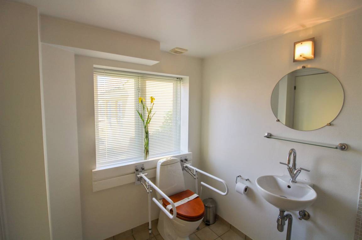 Das Badezimmer ist mit zusätzlichen Griffen in der Duschnische, einer Badebank und herunterklappbaren Armlehnen an der Toilette ausgestattet. Außerdem sind manuell bedienbare Lüftungsöffnungen über den Fenstern und elektrische Lüftungsöffnungen vorhanden, die sich über den Lichtschalter einschalten lassen. Der Couchtisch kann dank Rollen leicht verschoben werden. Die Eingangstür, die Toilettentür und die Tür zum Schlafzimmer mit Doppelbett sind je 76 cm breit, sodass man sich in diesem Haus mit kleineren Rollstühlen fortbewegen kann. Den ebenerdigen Zugang zur Wohnung erreichen Sie über den Supermarktparkplatz durch das Tor neben dem Kundeneingang des SPAR-Supermarktes, in dem man auch Bake-off-Waren kaufen kann.
