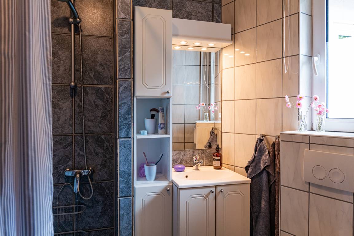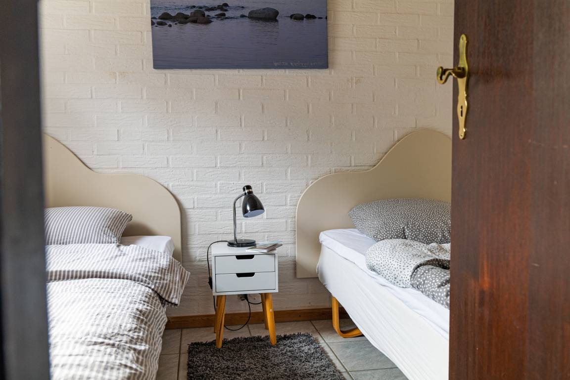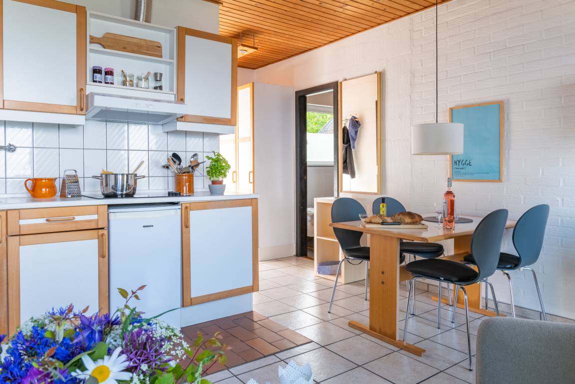 Die Ferienwohnung ist praktisch eingerichtet und verfügt über einen Wohnraum, einen Essplatz und eine Küchenzeile. Zudem gibt es ein eigenes Duschbad/WC, Schlafzimmer mit zwei Einzelbetten sowie ein separates Schlafzimmer mit einem Einzelbett (90/200).