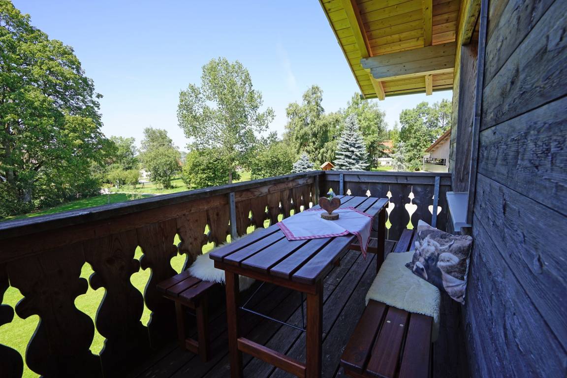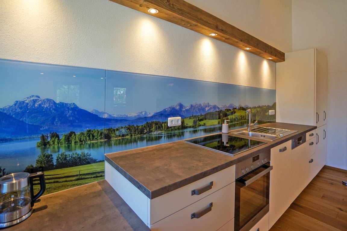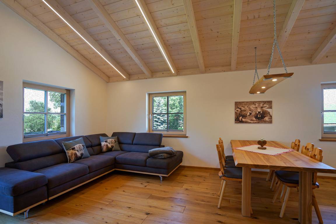 - großer, offener, heller Wohnraum mit gemütlicher Couch, großzügiger Küche mit gemütlichem Essplatz im Allgäuer Stil und Balkonzugang