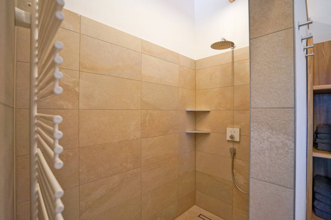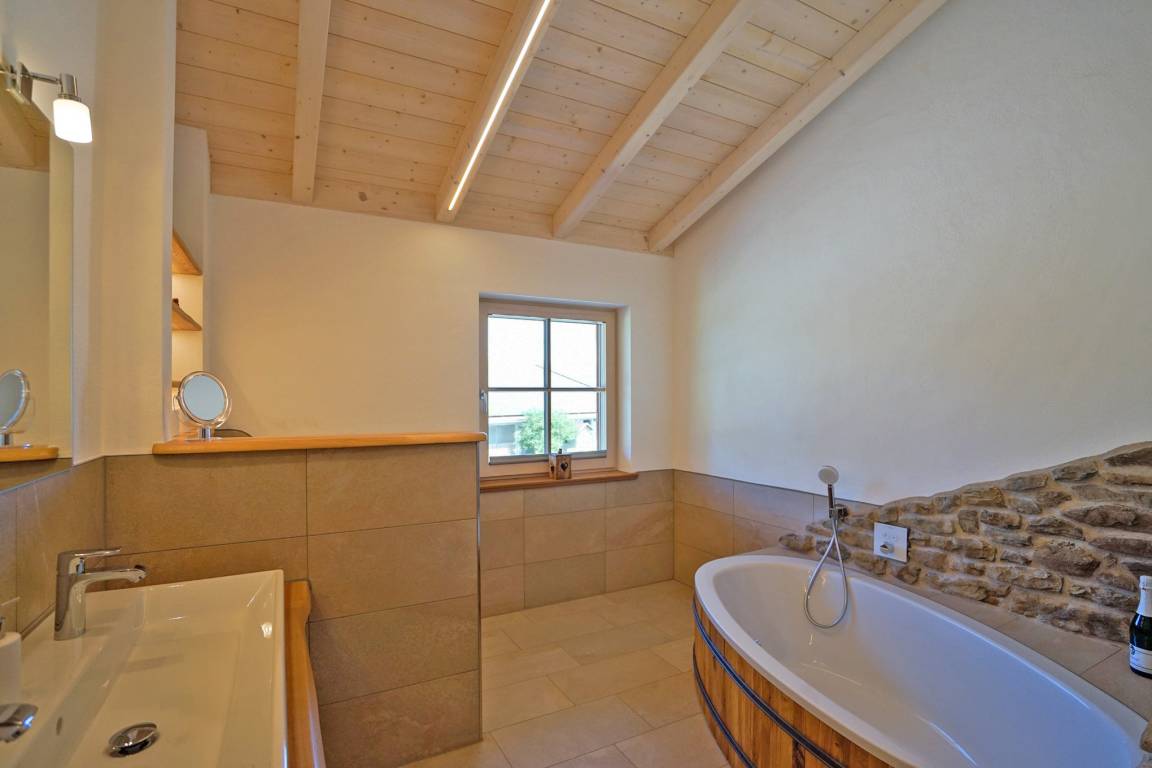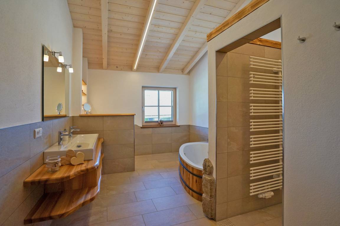 - großes Bad mit Badewanne im Holzzuber Stil, großzügige moderne begehbare Dusche und WC