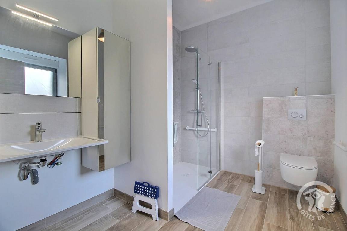 Großes Wohnzimmer mit Verbindung zu einer schönen Einbauküche (5-Flammen-Klavierofen). 1 Schlafzimmer für Personen mit eingeschränkter Mobilität (1 Bett 180x200), angrenzendes behindertengerechtes Badezimmer (Dusche und WC), ein weiteres separates WC.