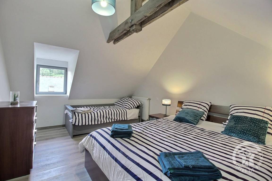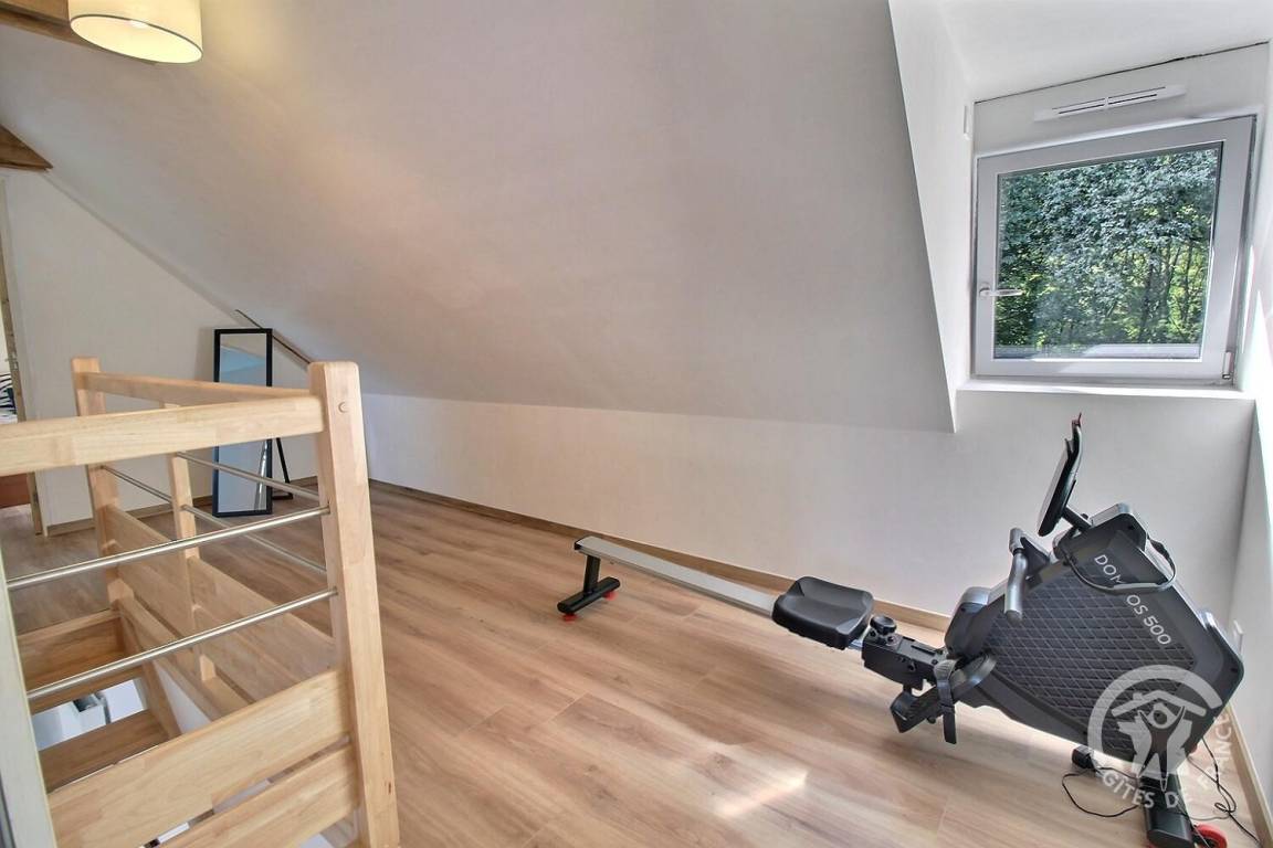 1 Schlafzimmer (1 Bett 160x200 + 1 Bett 90x190), 1 Schlafzimmer (1 Bett 180x200), Badezimmer (Dusche und WC), 1 Rudergerät im Zwischengeschoss.