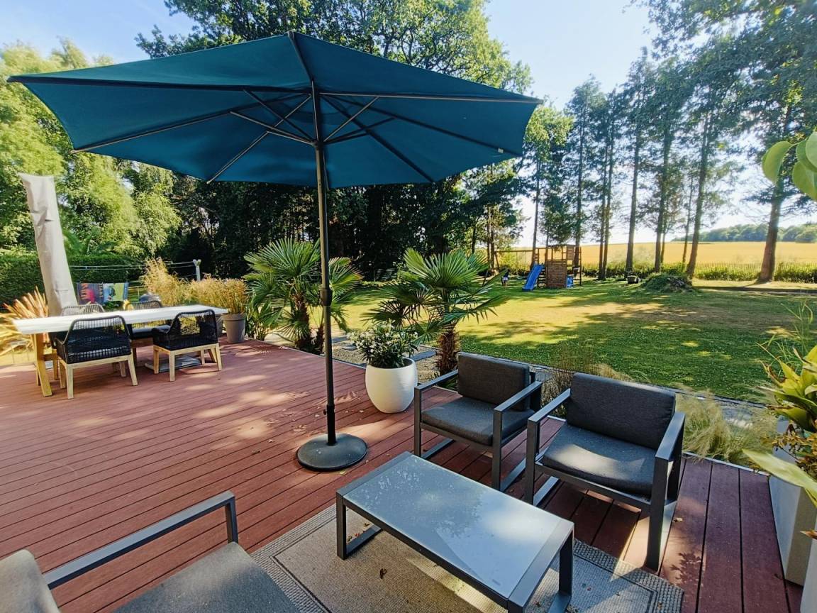 Terrasse möbliert mit Tisch und Stühlen, Gartenmöbeln, Sonnenschirm, Grill