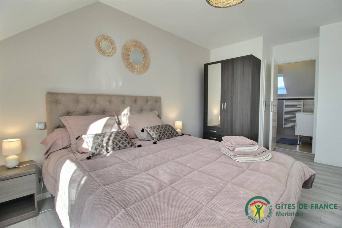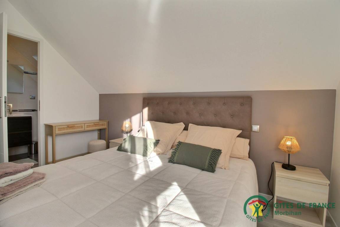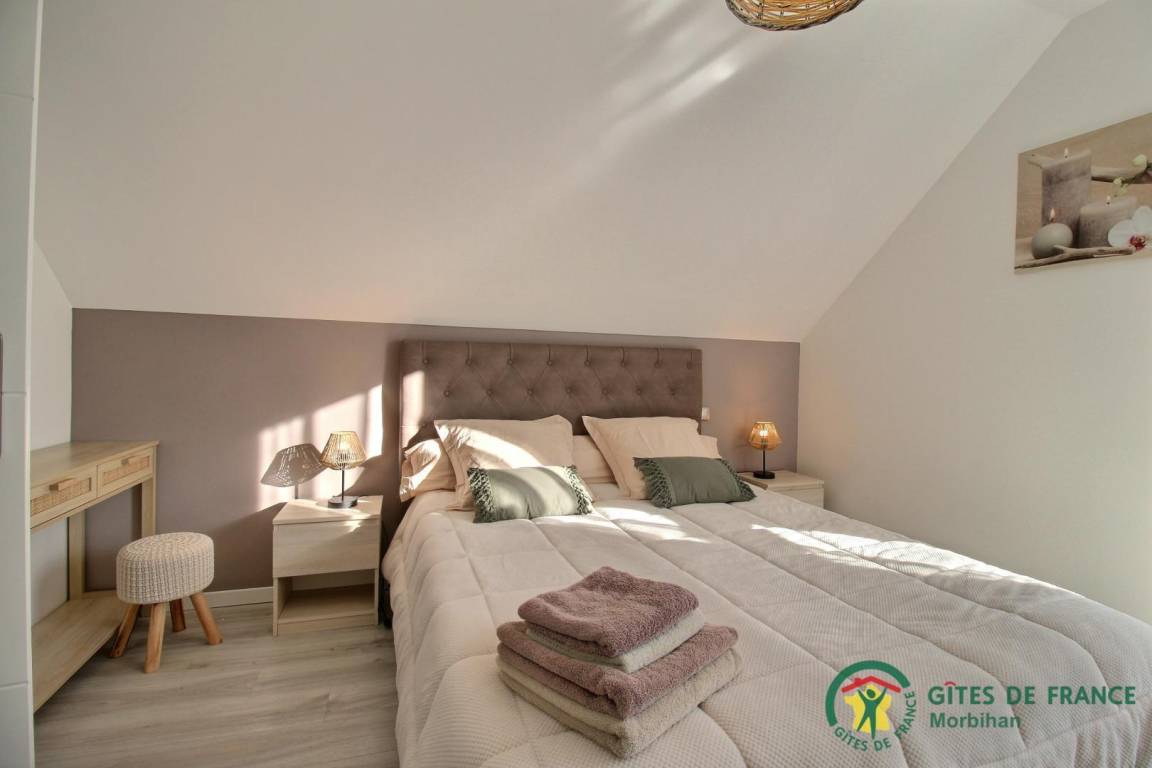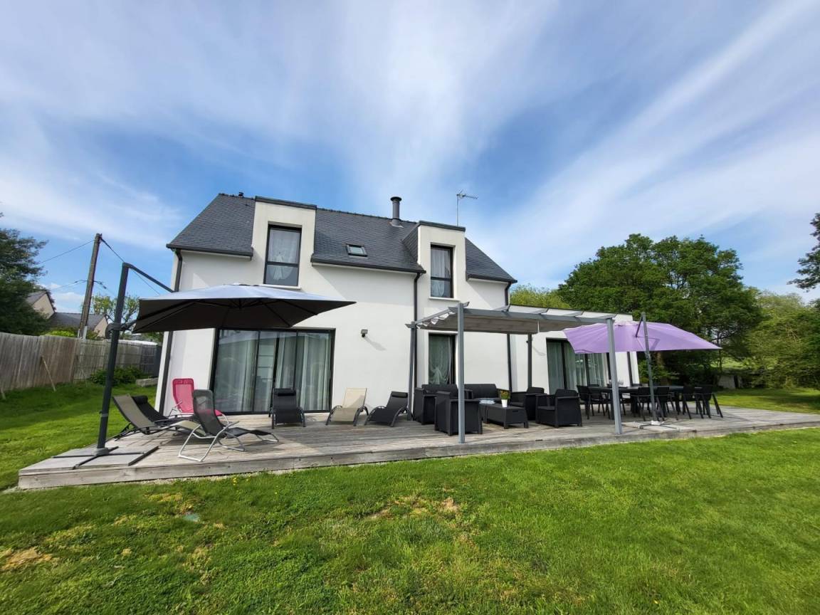 Entdecken Sie den gemütlichen Badeort Guidel im Süd-Morbihan. Das Ferienhaus, ideal gelegen, ist nur 6 km vom Meer entfernt: Badespaß, Wassersport, Segeln, Angeln… Die lebendige Stadt Lorient ist 10 Min vom Haus entfernt: Häfen, Museen, Geschäfte. Schönes und modern gebautes Ferienhaus mit viel Komfort, Licht und Raum. Hier fühlt man sich so richtig wohl, gemütliches Ambiente und gepflegtes Dekor. Im EG: Wohnbereich mit Küche/Wohnzimmer, WC, 2 Zi. mit eigenem Bad mit Dusche/WC, eines mit 1 Bett 160, das andere mit 1 Bett 160 und 1 Bett 90, Waschküche. Im 1. Stock: 3 Zi. mit eigenem Bad mit Dusche/WC (3 Betten 160). Terrasse, geschlossener Garten, Parkplatz. Ein Spazierweg geht direkt beim Ferienhaus weg. Kurtaxe: nach aktuellem Normaltarif/Nacht/Erwachsener, das ganze Jahr. Stromverbrauch: 56kw/h inklusive, bei darüber hinausgehendem Verbrauch Berechnung nach aktuellem Normaltarif. Ferienhaus in der Nähe der Vermieter und der Schnellstraße (300m).