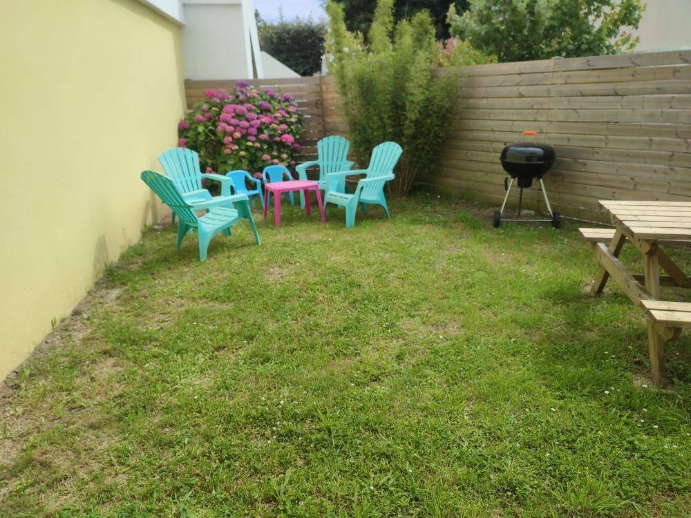 Eingezäunter Garten mit Tisch, Stühlen und Grill