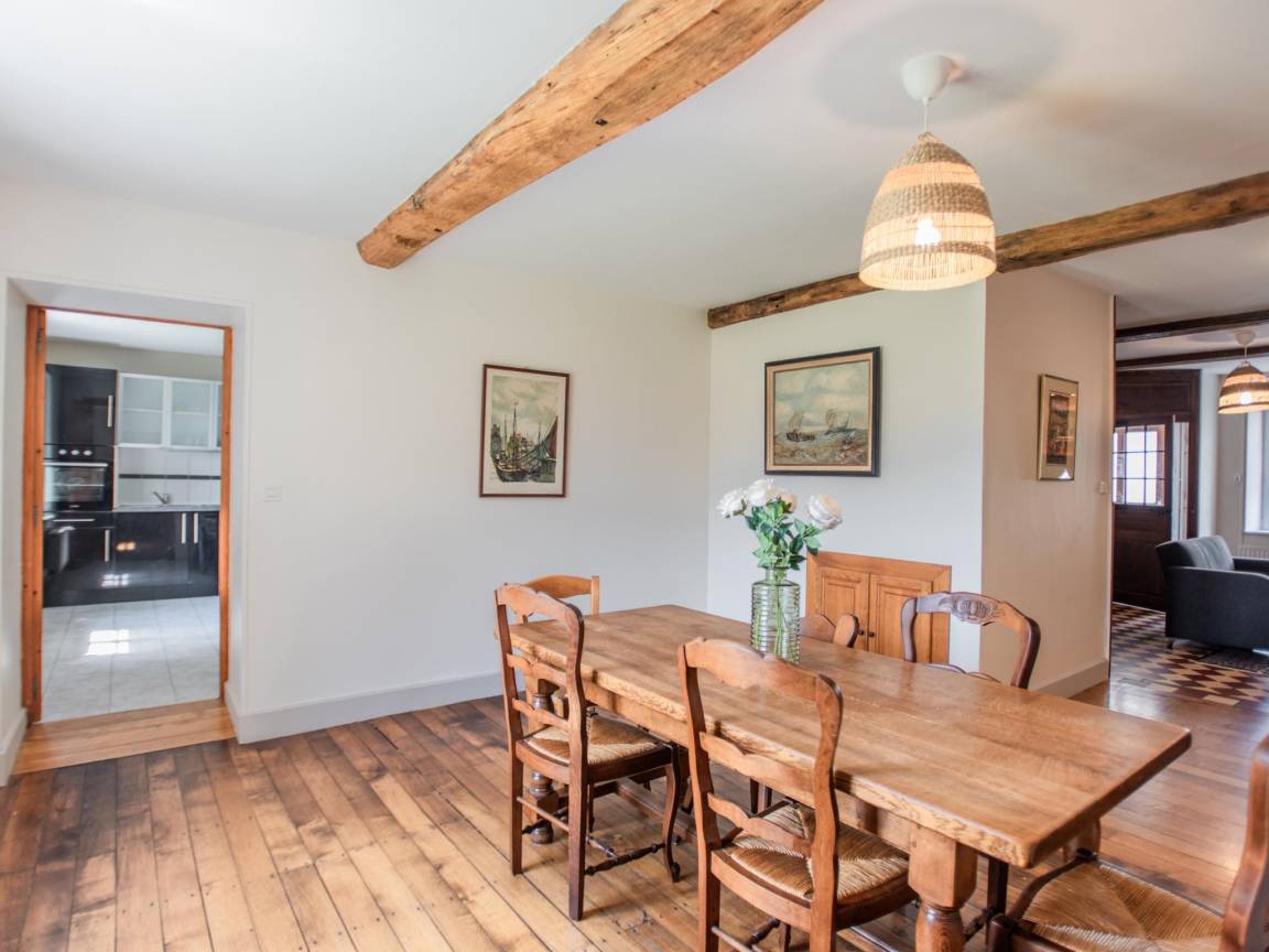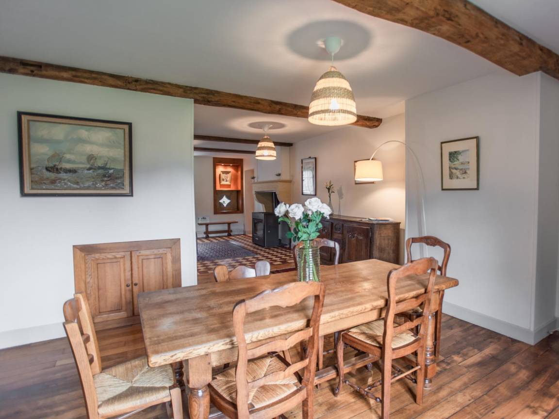 Layout : Parterre: Wohnzimmer mit Ofen(Holz), Sitzecke , Esszimmer mit Esstisch(8 Personen) , Küche mit Esstisch(2 Personen), Wasserkocher, Toaster, Kochherd(4 Kochplatten, elektrisch), Dunstabzugshaube, Kaffeemaschine(Filter), Backofen, Mikrowelle, Geschirrspüler, Kühl-/Gefrierkombination, Stabmixer , Toilette