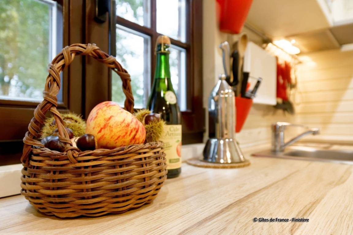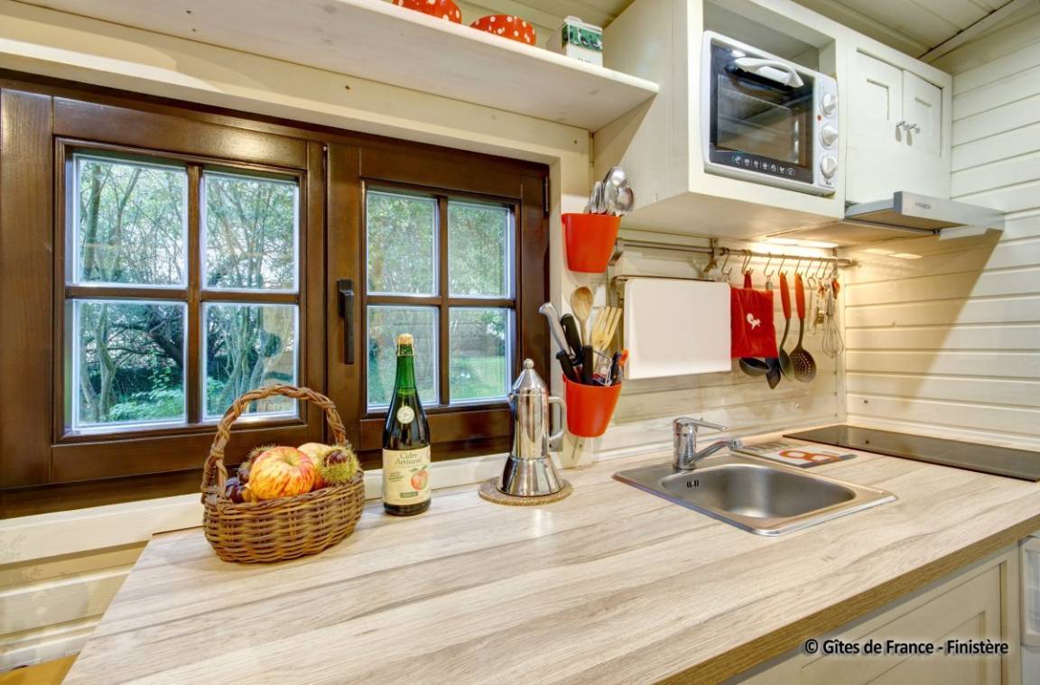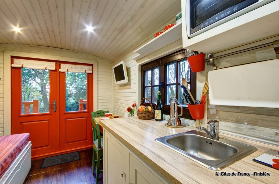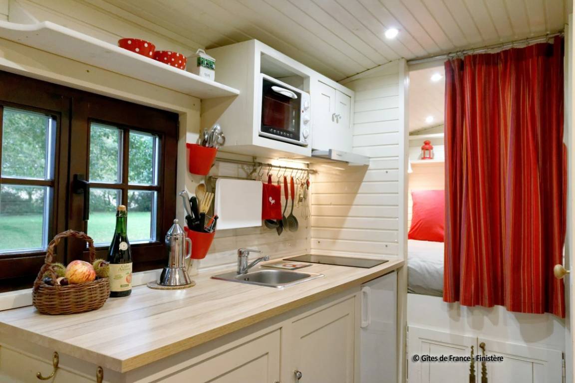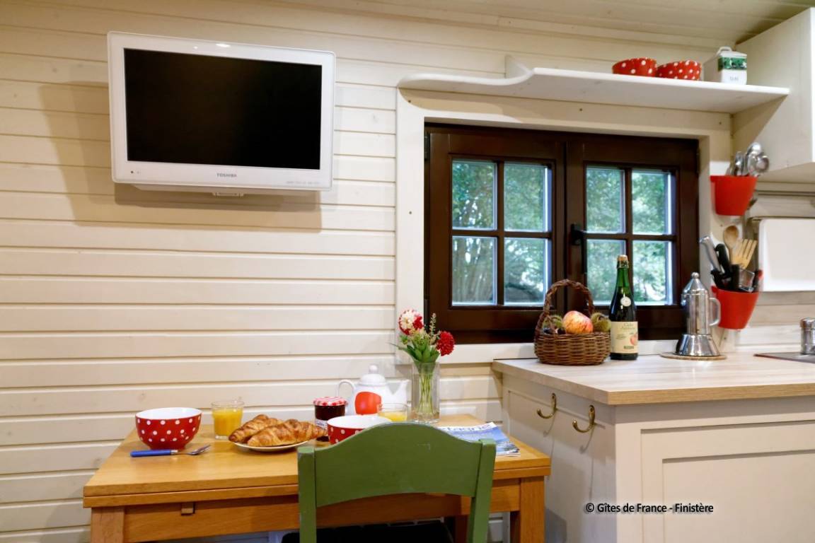 Dieser traditionelle Zigeunerwagen aus Holz gehört zum Grundbesitz von 'Kéraléguen Vian' und befindet sich bei zwei weiteren Gîtes im bretonischen Stil und ohne Gegenüber. Doppelbett im Alkoven (1,90 x 1,40m - das Bett ist bezogen), Bettcouch für 2 Kinder (1,90 x 1,20m), Dusche mit Waschbecken und WC, eingebaute Kochecke (Geschirr, Kochplatte, Kühlschrank, Mini-Backofen, Elektrische Kaffeemaschine), Tisch, Stühle, gepolsterte Bank. E-Heizung. Garten mit Baumbestand (2000m²), Gartenmöbel, Grill.