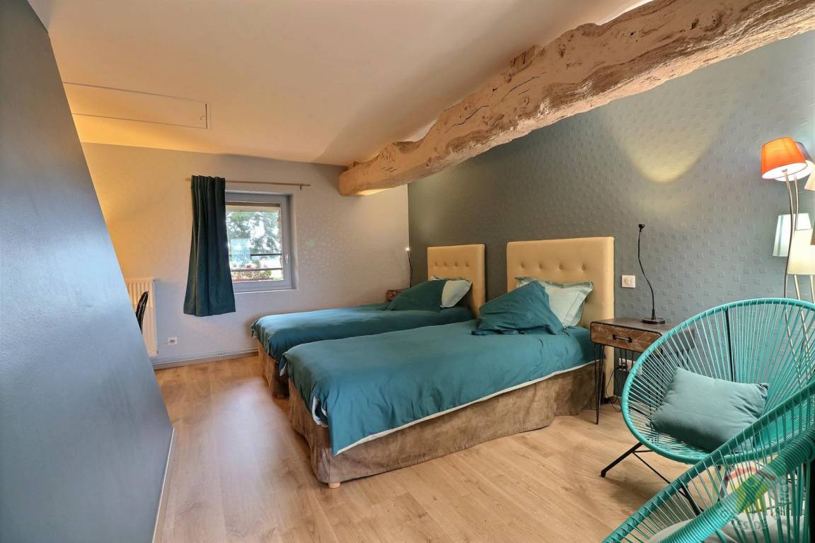 Vermietung im Obergeschoss: ein Eingang, ein Schlafzimmer mit zwei 90 x 200 cm großen Betten, die in ein Doppelbett umgewandelt werden können, ein Wohnzimmer mit einer kleinen Küche und einem Ruhebereich, ein Schlafzimmer mit einem 160 x 200 cm großen Bett, ein Duschbad und ein separates WC. Bettwäsche und Handtücher inklusive. Elektrische Heizung durch Wärmepumpe und Erdwärme im Preis inbegriffen. Privater Parkplatz auf dem Grundstück.