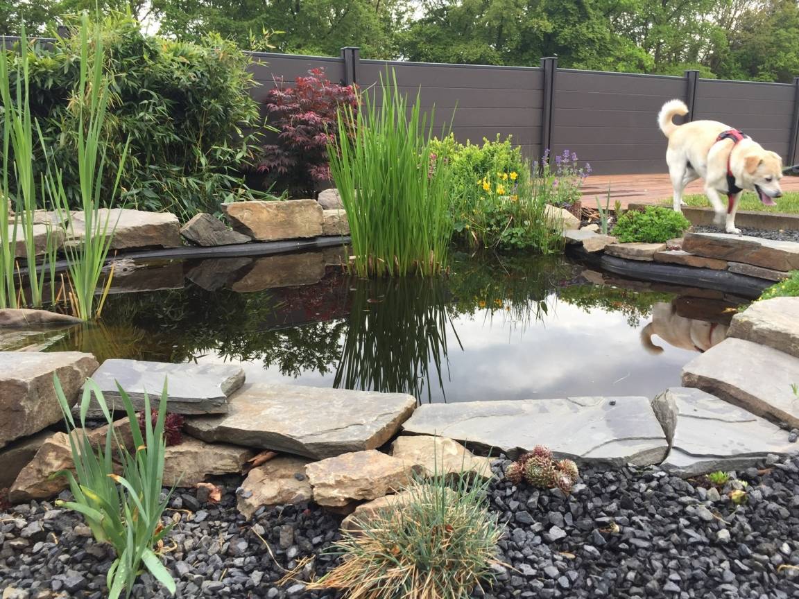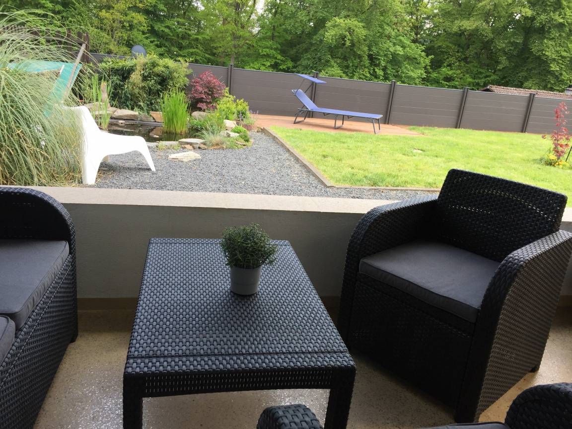 Das über 500qm große Grundstück ist höher gelegen, so dass der Garten mit Teich, Sitzplätzen und überdachter Terrasse viel Privatsphäre bietet. Zudem ist es komplett umzäunt, sprich, Ihre Kinder oder Ihre Vierbeiner können sich im Garten frei bewegen.