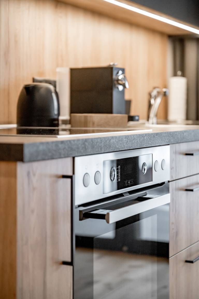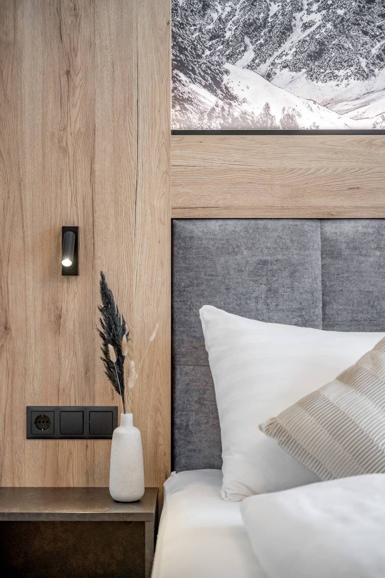 Unsere Apartments № THREE in Oetz im Ötztal befindet sich im ersten Obergeschoß und ist einfach über den Personenaufzug zu erreichen. Es begeistert mit sonnigem, offenem Wohn-Ess-Kochbereich und voll ausgestatteter Küche inkl. ausziehbarer Couch und einer direkt an den Wohnbereich angrenzender Zirbenholz-Sauna mit integriertem Infrarotstrahler. Das Apartment bietet zwei Schlafzimmer, eines davon ist ausgestattet mit einem Doppel-Boxspringbett, das zweite mit einem Doppel-Boxspringbett und zusätzlich einem Einzelbett. Die Schlafzimmer verfügen jeweils über ein großzügiges, modernes Badezimmer mit Dusche & WC.