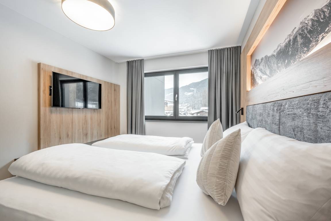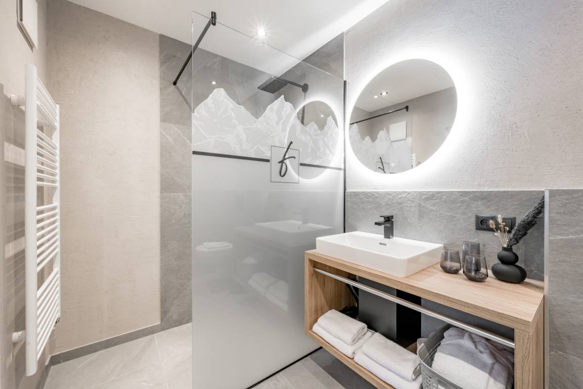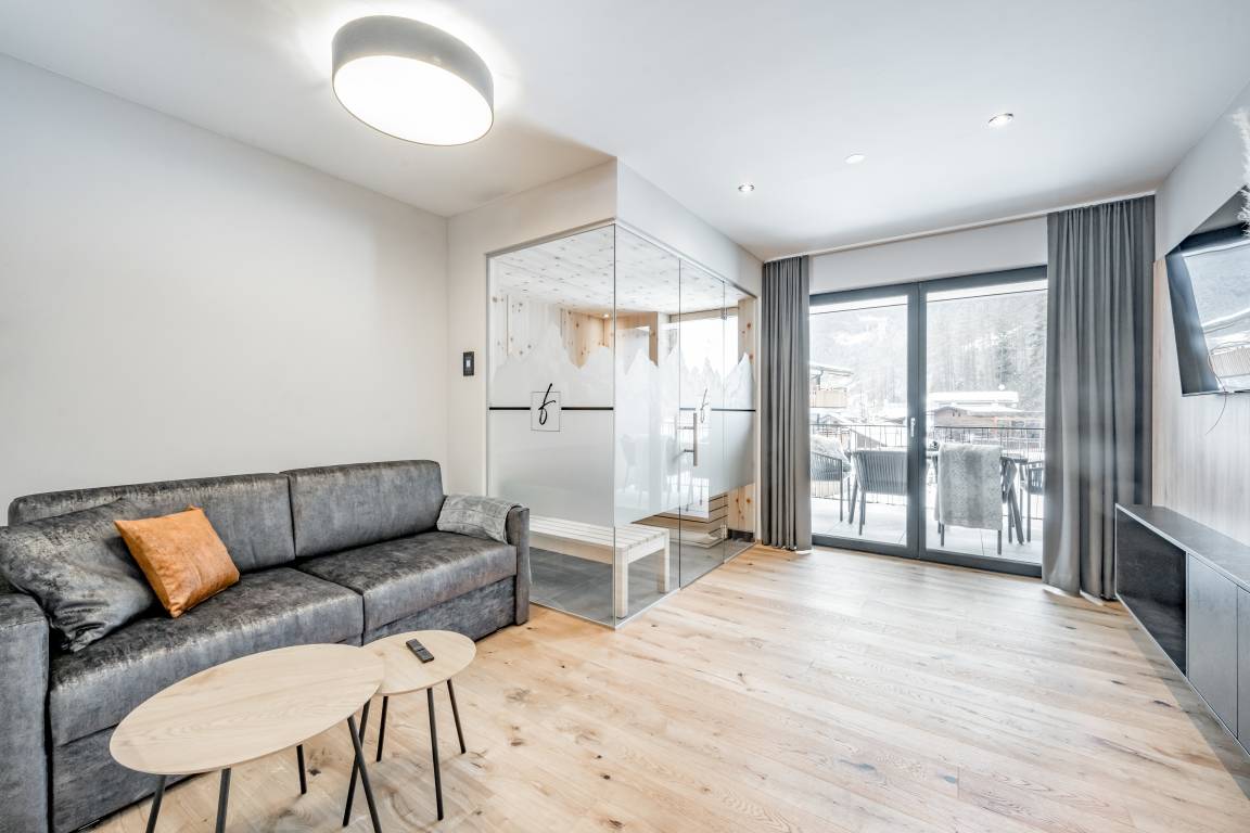 Apartment № TWO im ersten Obergeschoß begeistert mit einem offenem Wohn-Ess-Kochbereich mit voll ausgestatteter Küche inkl. ausziehbarer Couch und einer vom Wohnbereich aus zugänglicher Zirbenholz-Sauna mit integriertem Infrarotstrahler. Es bietet zwei Schlafzimmer mit Doppel-Boxspringbetten und je einem großzügigen, modernen Badezimmer mit Dusche & WC. Das Apartment ist auch über den Personenaufzug erreichbar.