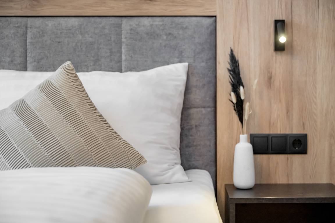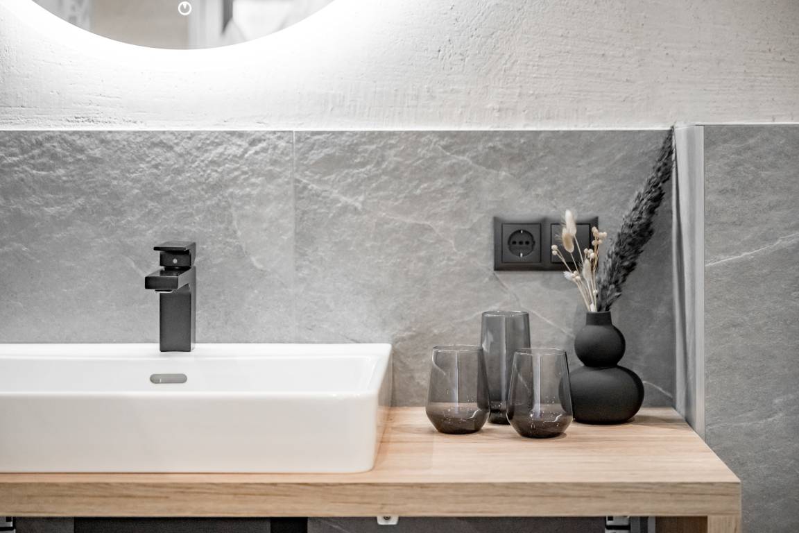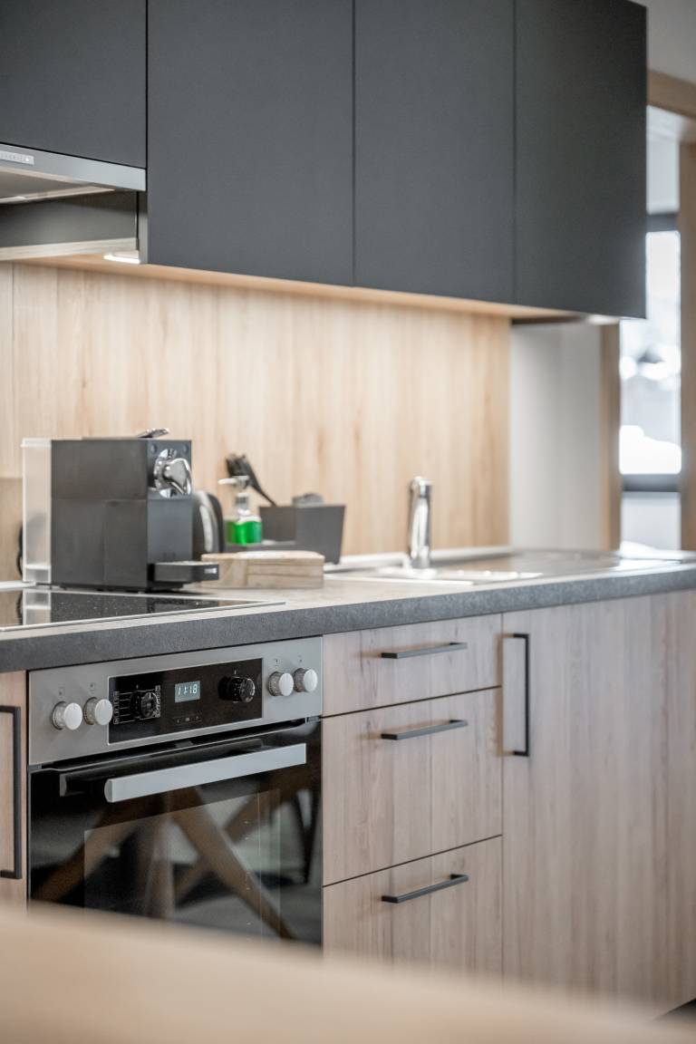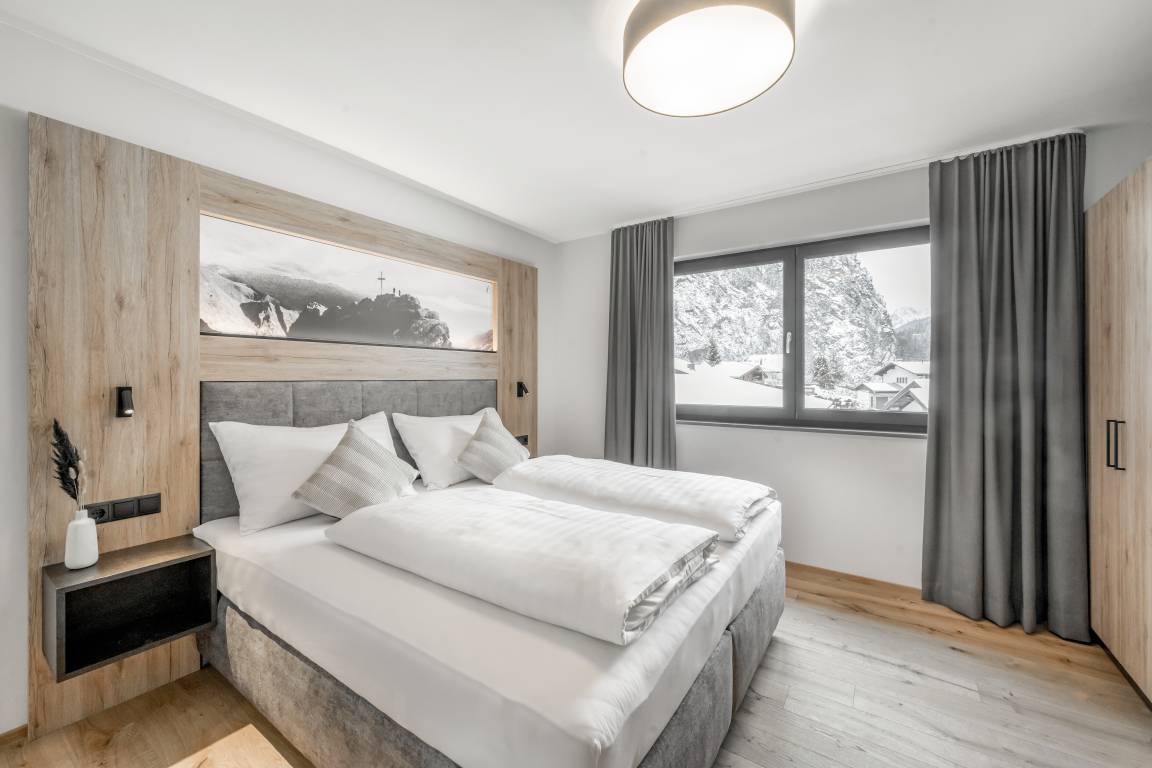 Apartment № TWO im ersten Obergeschoß begeistert mit einem offenem Wohn-Ess-Kochbereich mit voll ausgestatteter Küche inkl. ausziehbarer Couch und einer vom Wohnbereich aus zugänglicher Zirbenholz-Sauna mit integriertem Infrarotstrahler. Es bietet zwei Schlafzimmer mit Doppel-Boxspringbetten und je einem großzügigen, modernen Badezimmer mit Dusche & WC. Das Apartment ist auch über den Personenaufzug erreichbar.