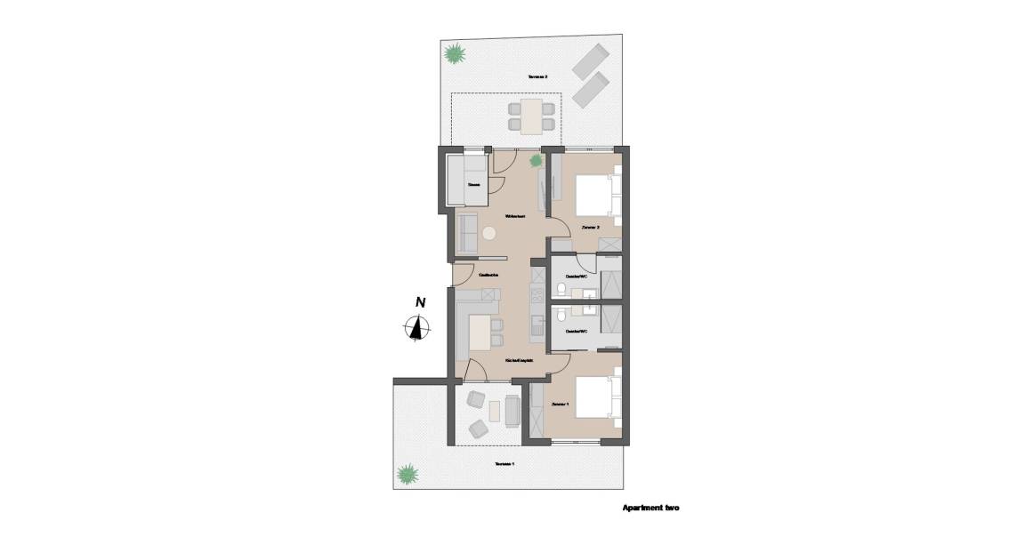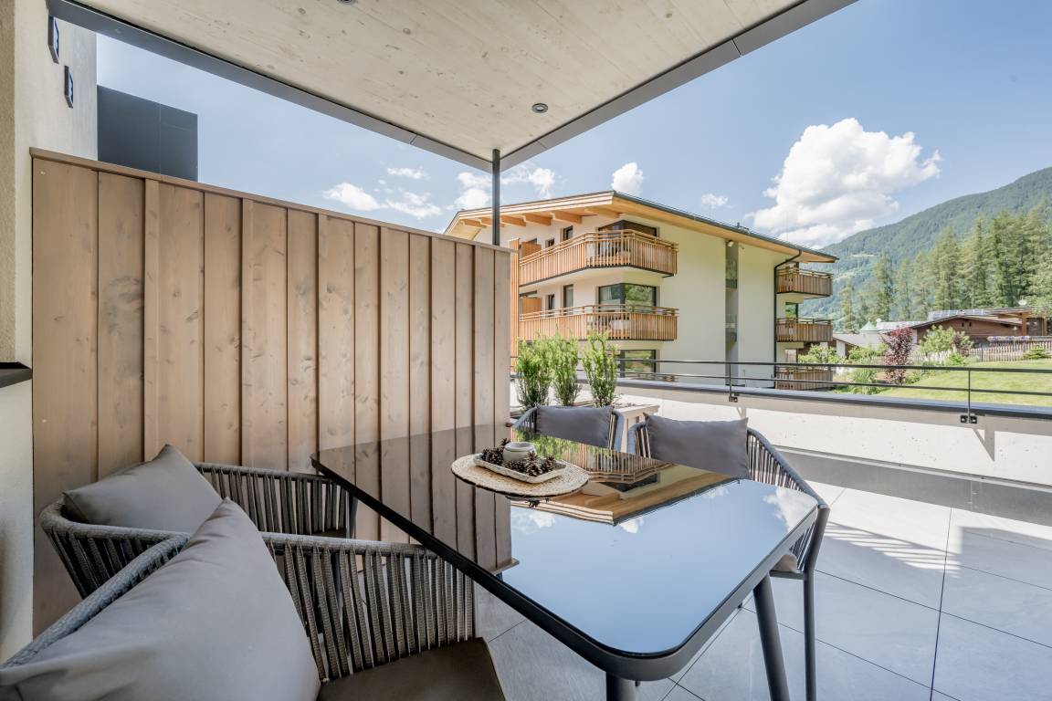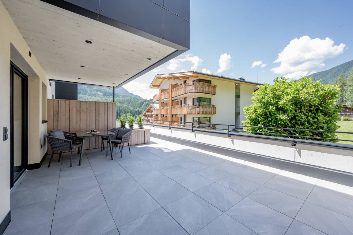 Das Apartment № TWO verfügt über zwei weitläufige Terrassen, eine nach Südosten ausgerichtete Sonnenterrasse sowie eine nach Nordwesten ausgerichtete Terrasse für laue Sommerabende. Beide Terrassen sind voll möbliert und zum Teil überdacht.
