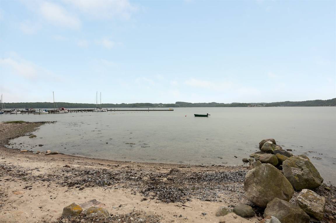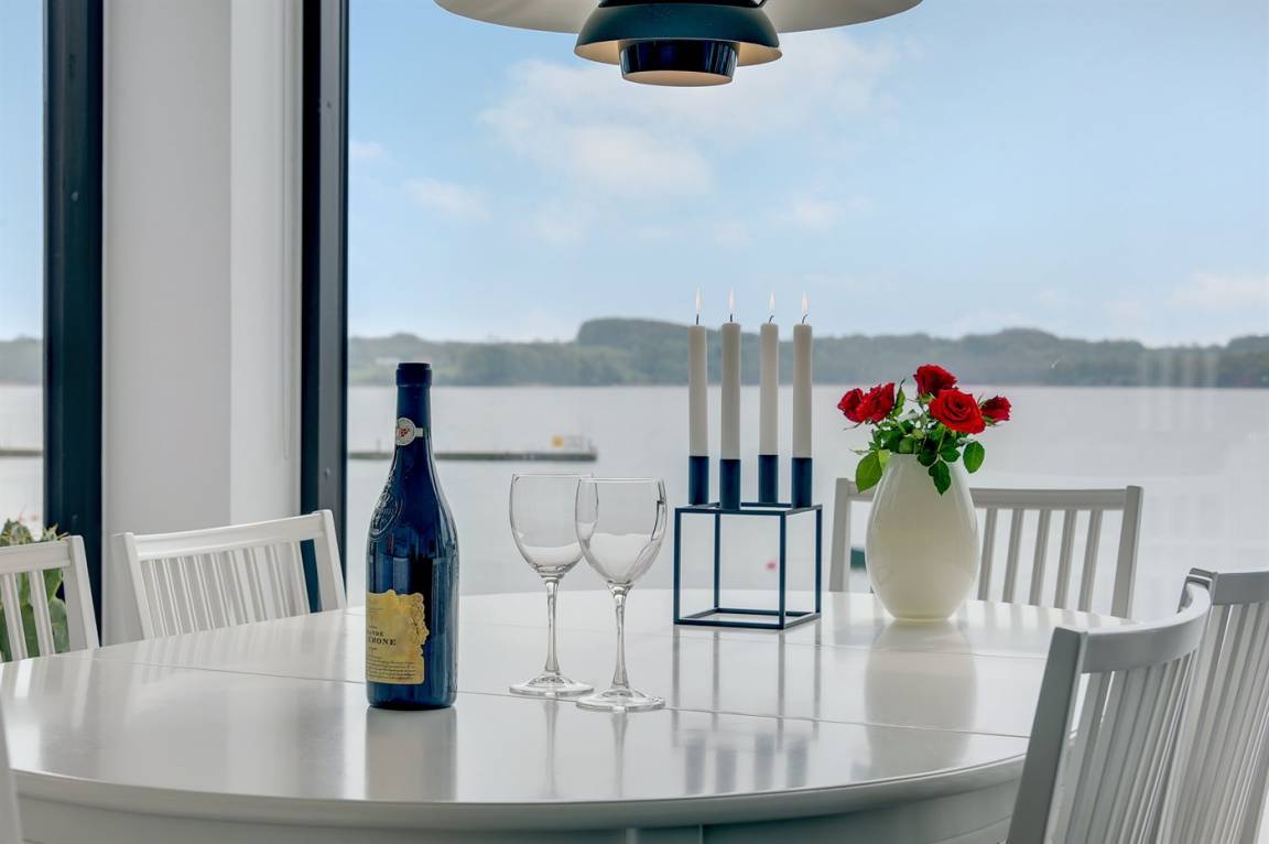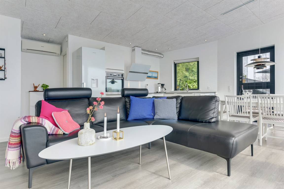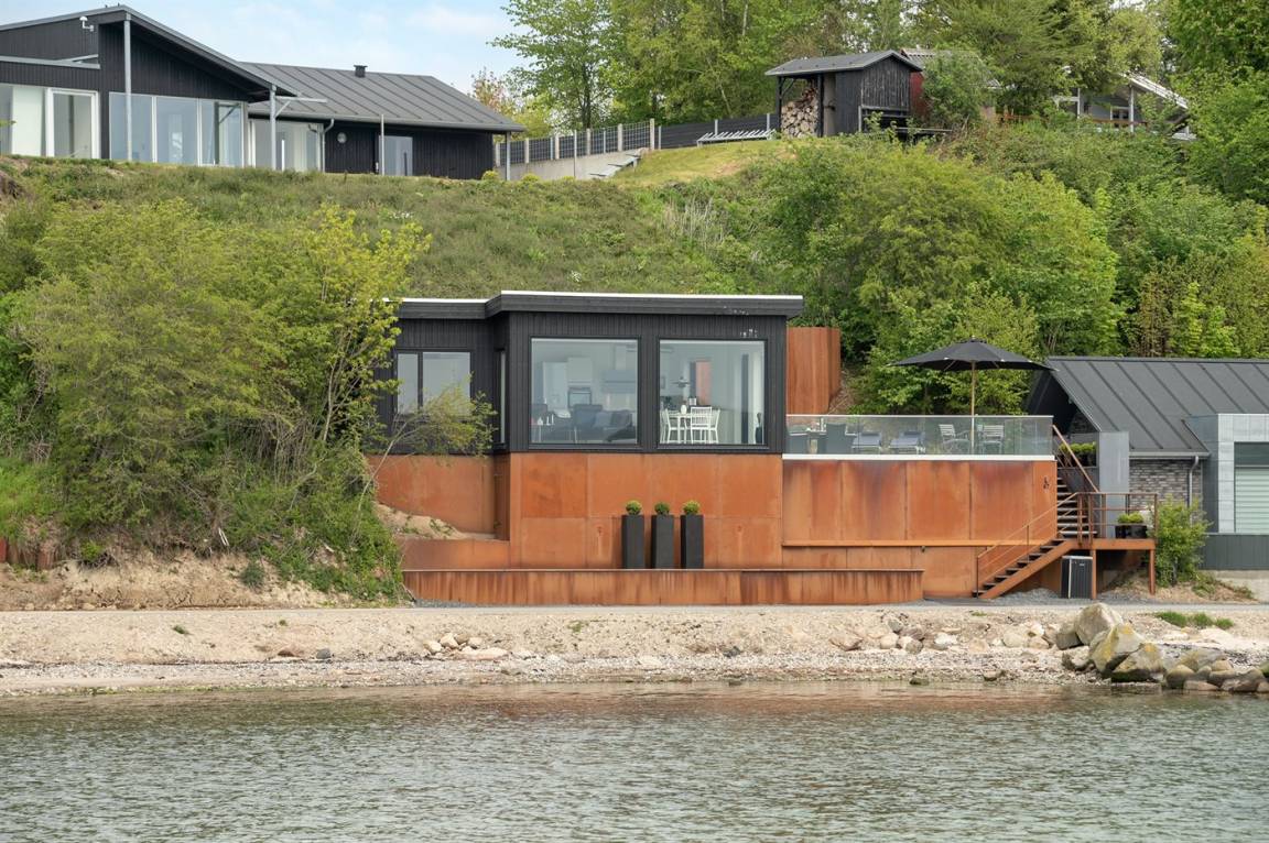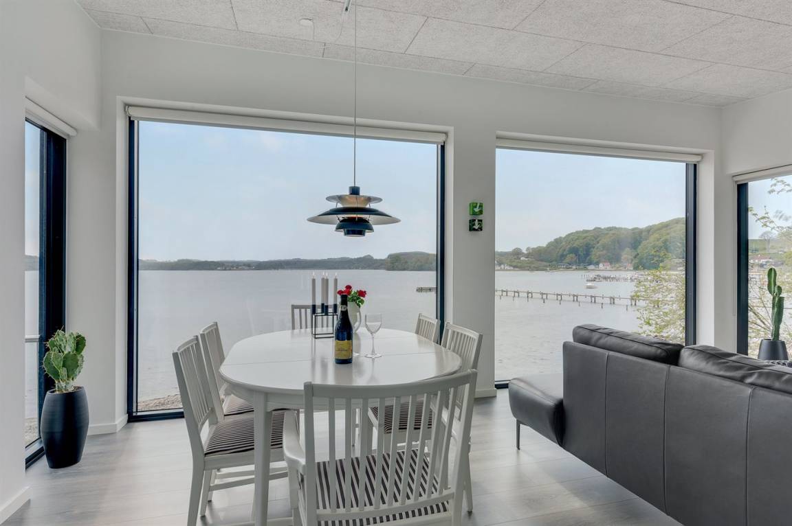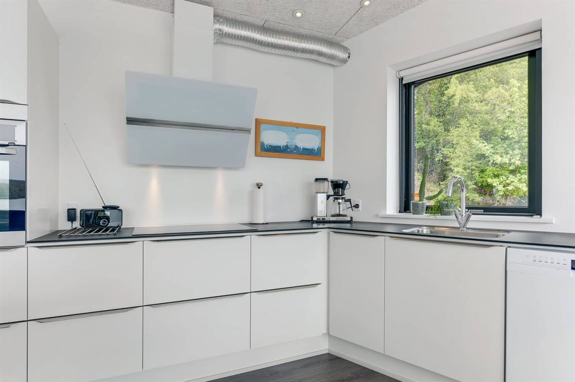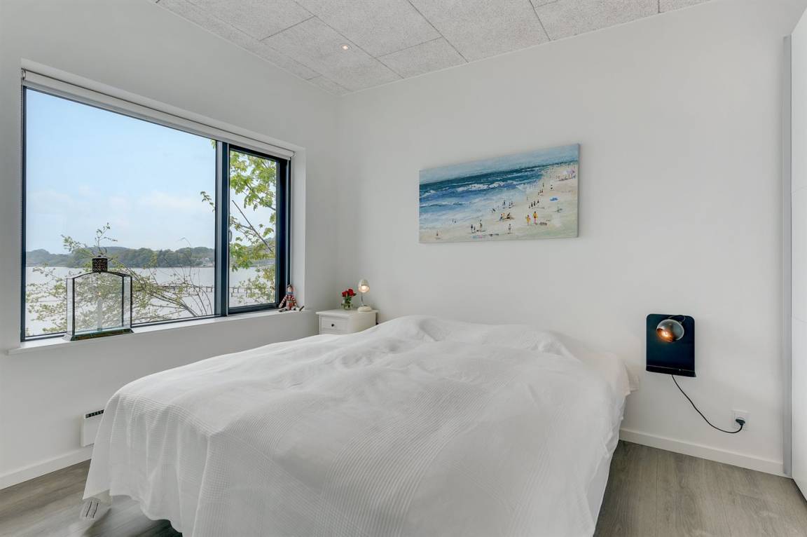 Im Schutz der Böschung, nur wenige Meter von der Strandkante entfernt, liegt dieses moderne und einladende Ferienhaus - 2018 gebaut. Die Wohnküche hat eine große Fensterfront, von hier aus kann man die Panoramaaussicht auf die Genner Bucht und die Insel Kalvø genießen. Auch vom großen Schlafzimmer und der schönen großen Terrasse, die ebenfalls im Schutz der Böschung liegt, gibt es eine einzigartige Aussicht über die Bucht.