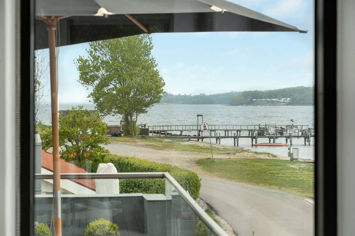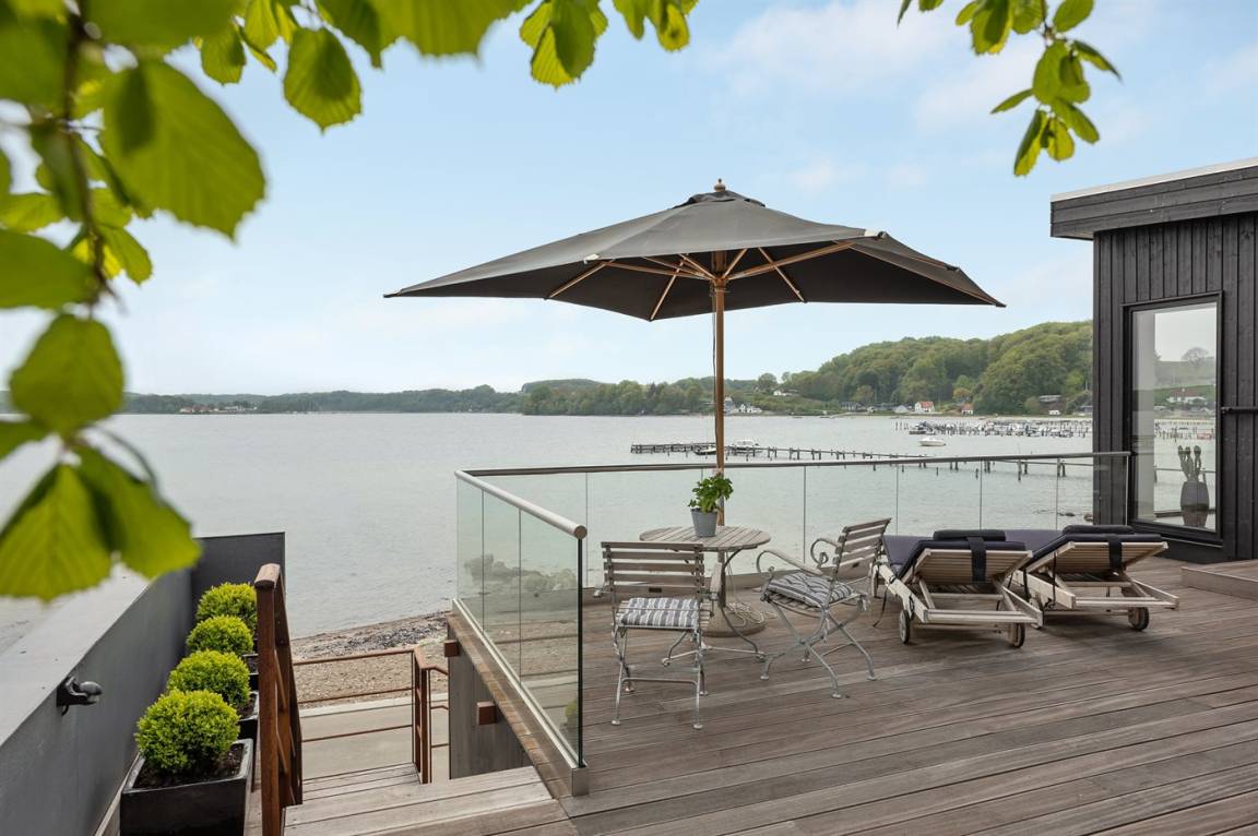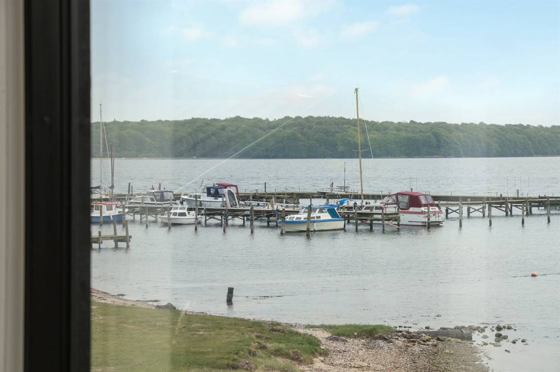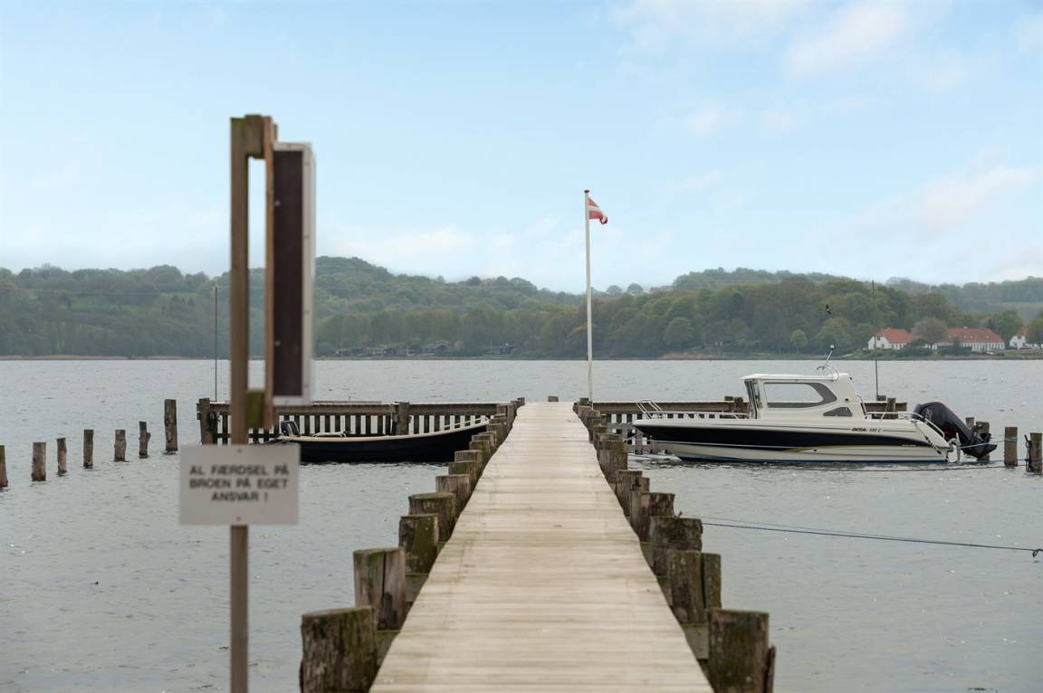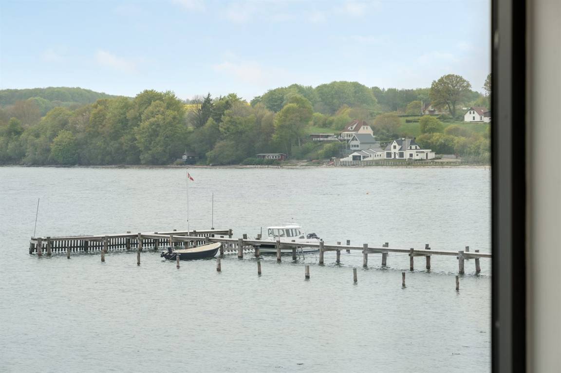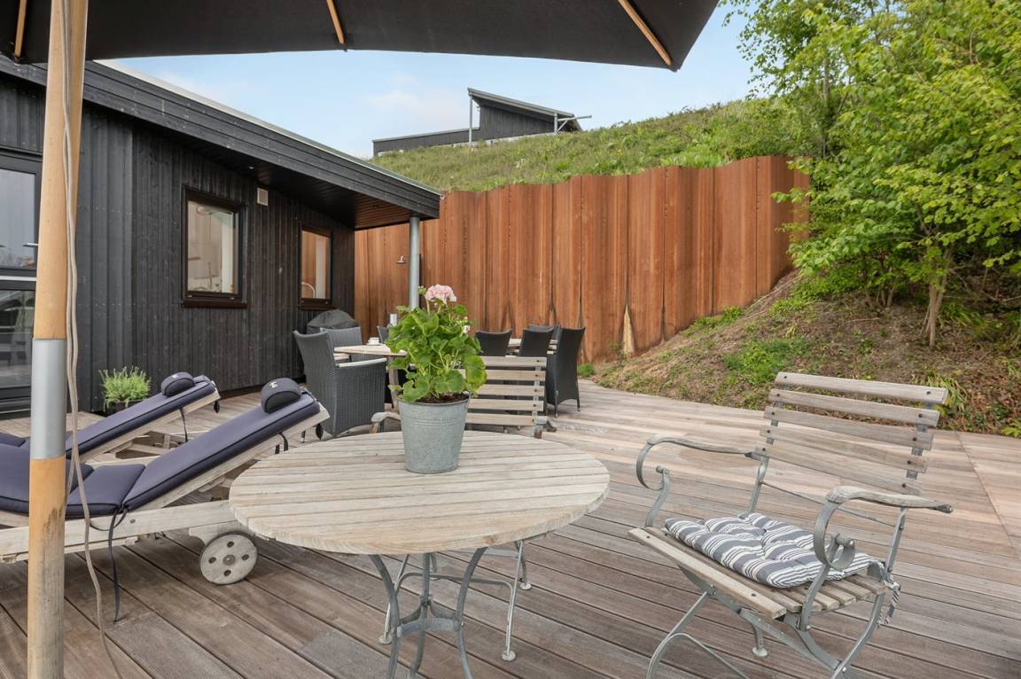 Im Schutz der Böschung, nur wenige Meter von der Strandkante entfernt, liegt dieses moderne und einladende Ferienhaus - 2018 gebaut. Die Wohnküche hat eine große Fensterfront, von hier aus kann man die Panoramaaussicht auf die Genner Bucht und die Insel Kalvø genießen. Auch vom großen Schlafzimmer und der schönen großen Terrasse, die ebenfalls im Schutz der Böschung liegt, gibt es eine einzigartige Aussicht über die Bucht.