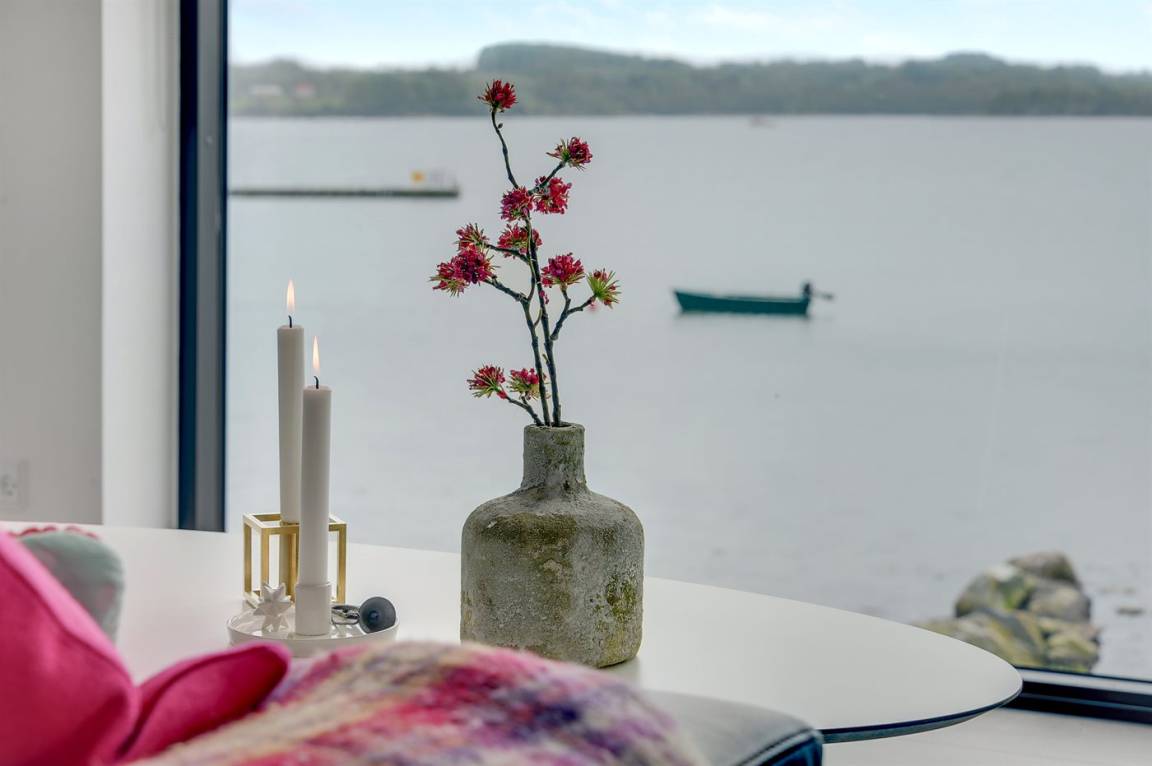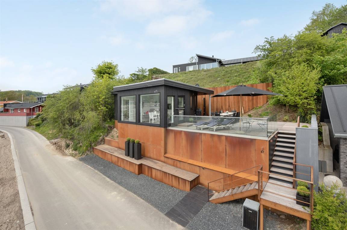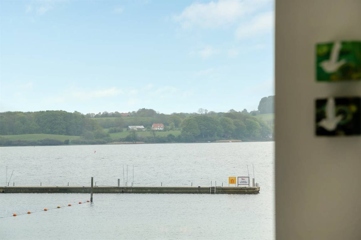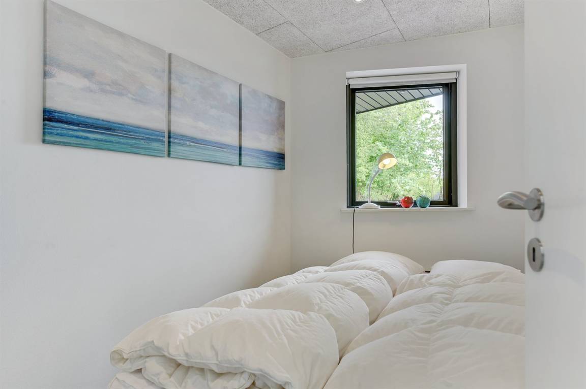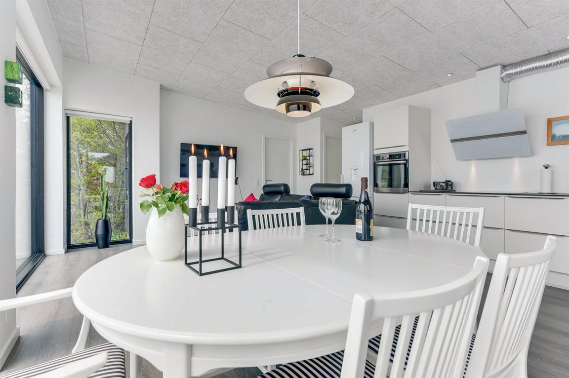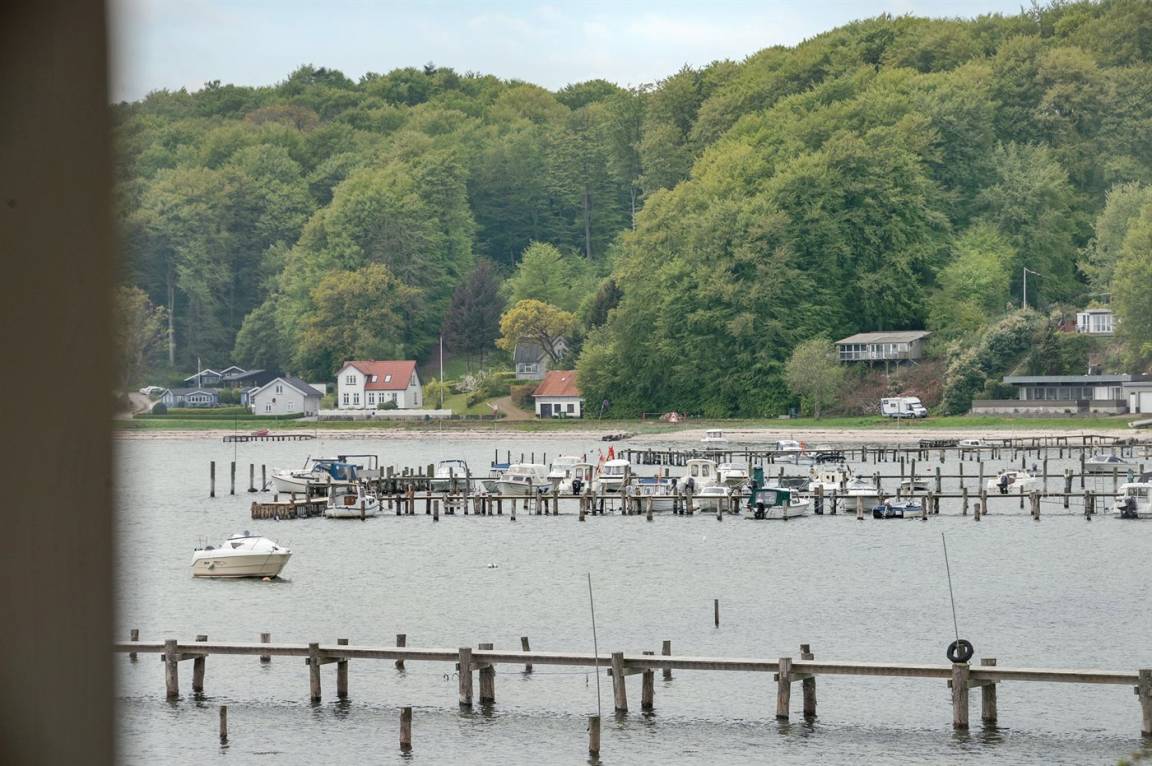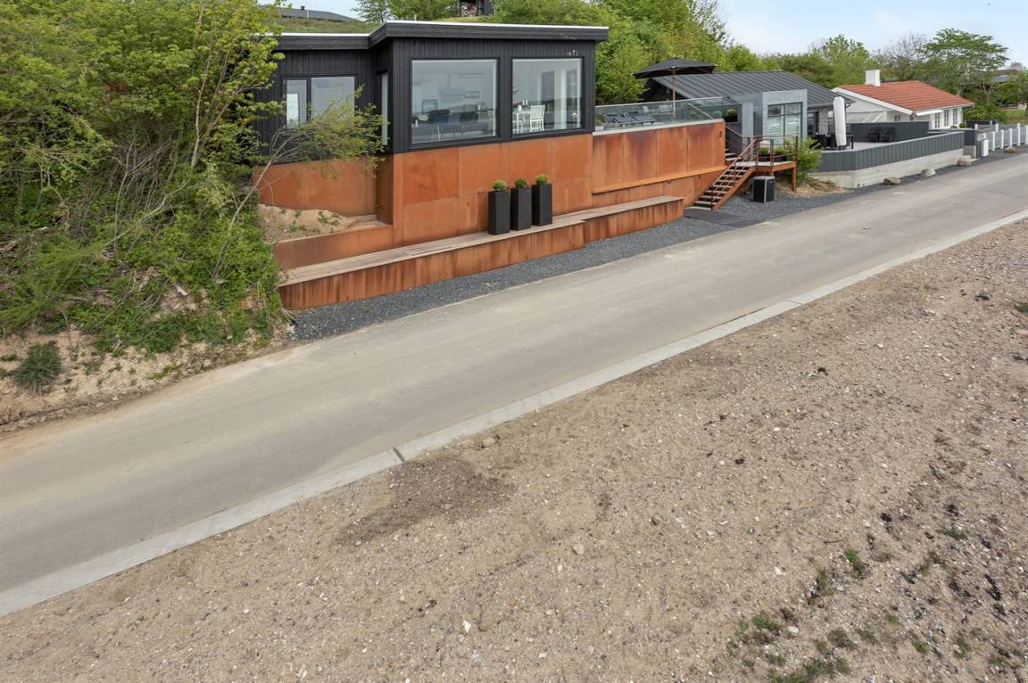 Im Schutz der Böschung, nur wenige Meter von der Strandkante entfernt, liegt dieses moderne und einladende Ferienhaus - 2018 gebaut. Die Wohnküche hat eine große Fensterfront, von hier aus kann man die Panoramaaussicht auf die Genner Bucht und die Insel Kalvø genießen. Auch vom großen Schlafzimmer und der schönen großen Terrasse, die ebenfalls im Schutz der Böschung liegt, gibt es eine einzigartige Aussicht über die Bucht.