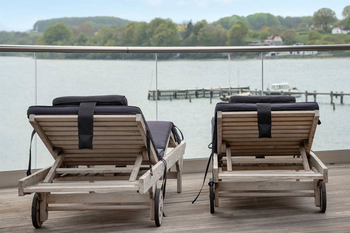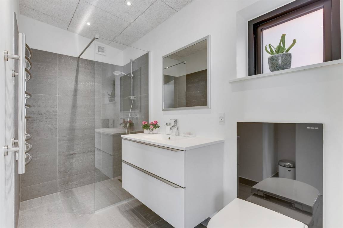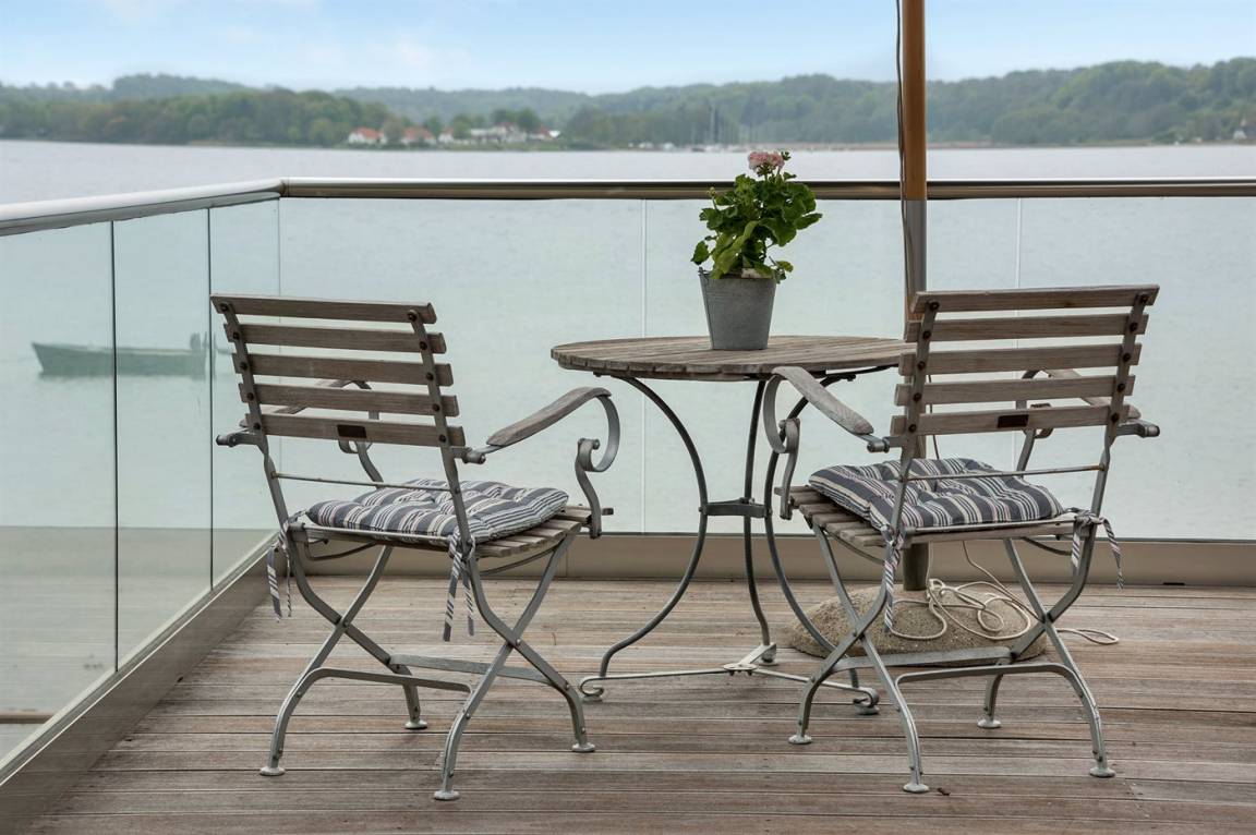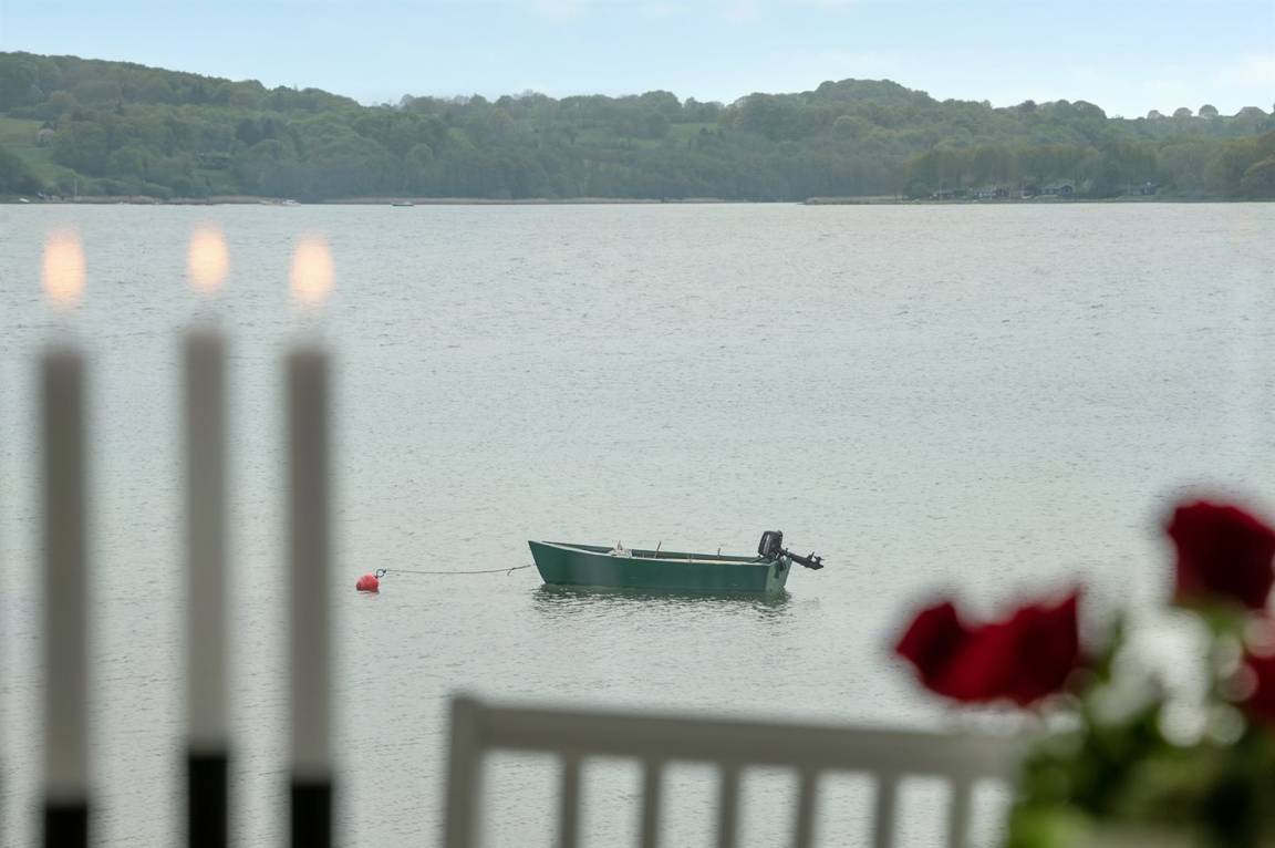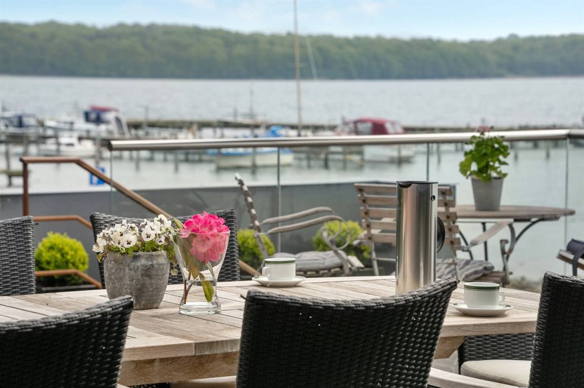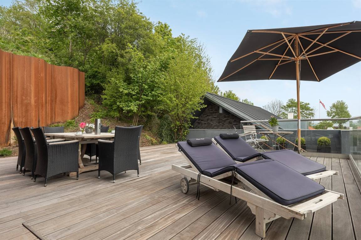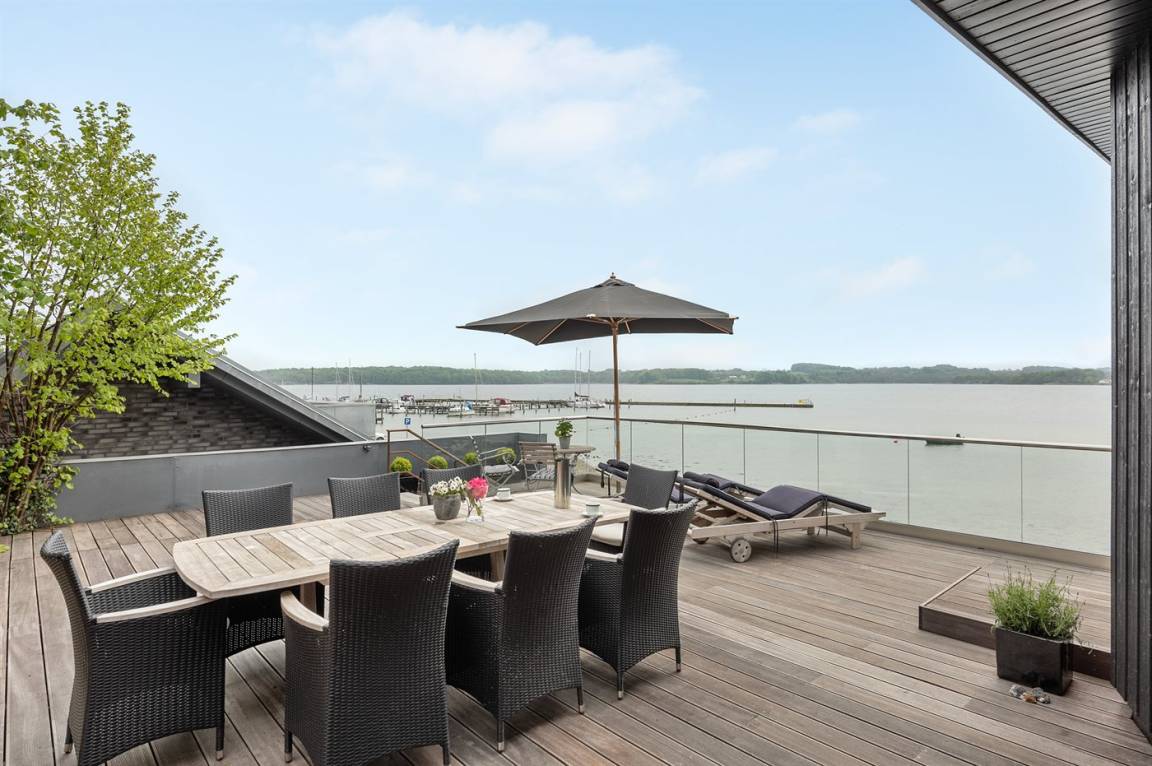 Im Schutz der Böschung, nur wenige Meter von der Strandkante entfernt, liegt dieses moderne und einladende Ferienhaus - 2018 gebaut. Die Wohnküche hat eine große Fensterfront, von hier aus kann man die Panoramaaussicht auf die Genner Bucht und die Insel Kalvø genießen. Auch vom großen Schlafzimmer und der schönen großen Terrasse, die ebenfalls im Schutz der Böschung liegt, gibt es eine einzigartige Aussicht über die Bucht.