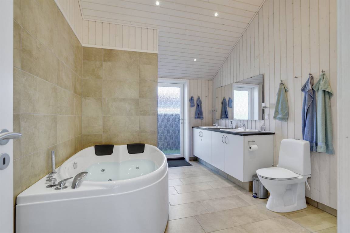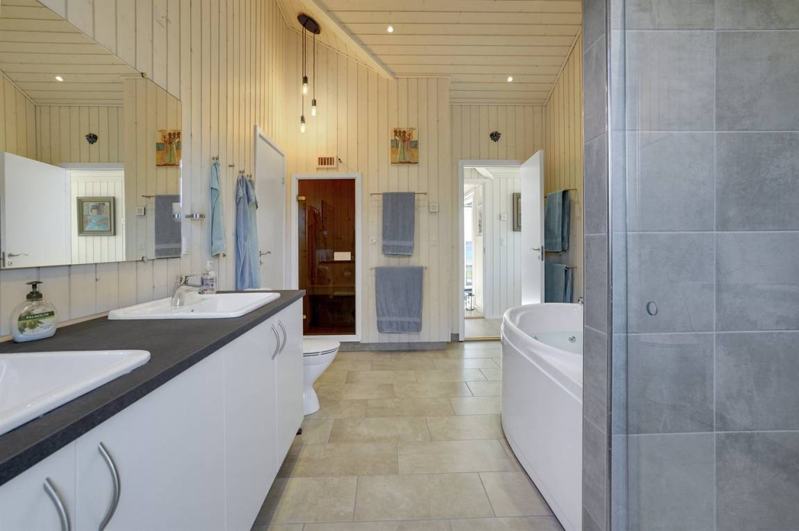 Das Haus ist mit 2 schönen und geräumigen Badezimmern eingerichtet, beide mit Fußbodenheizung und Duschnische. Das eine Badezimmer verfügt u. a. über einen 2-Pers.-Whirlpool und hat Zugang zur Sauna des Hauses.