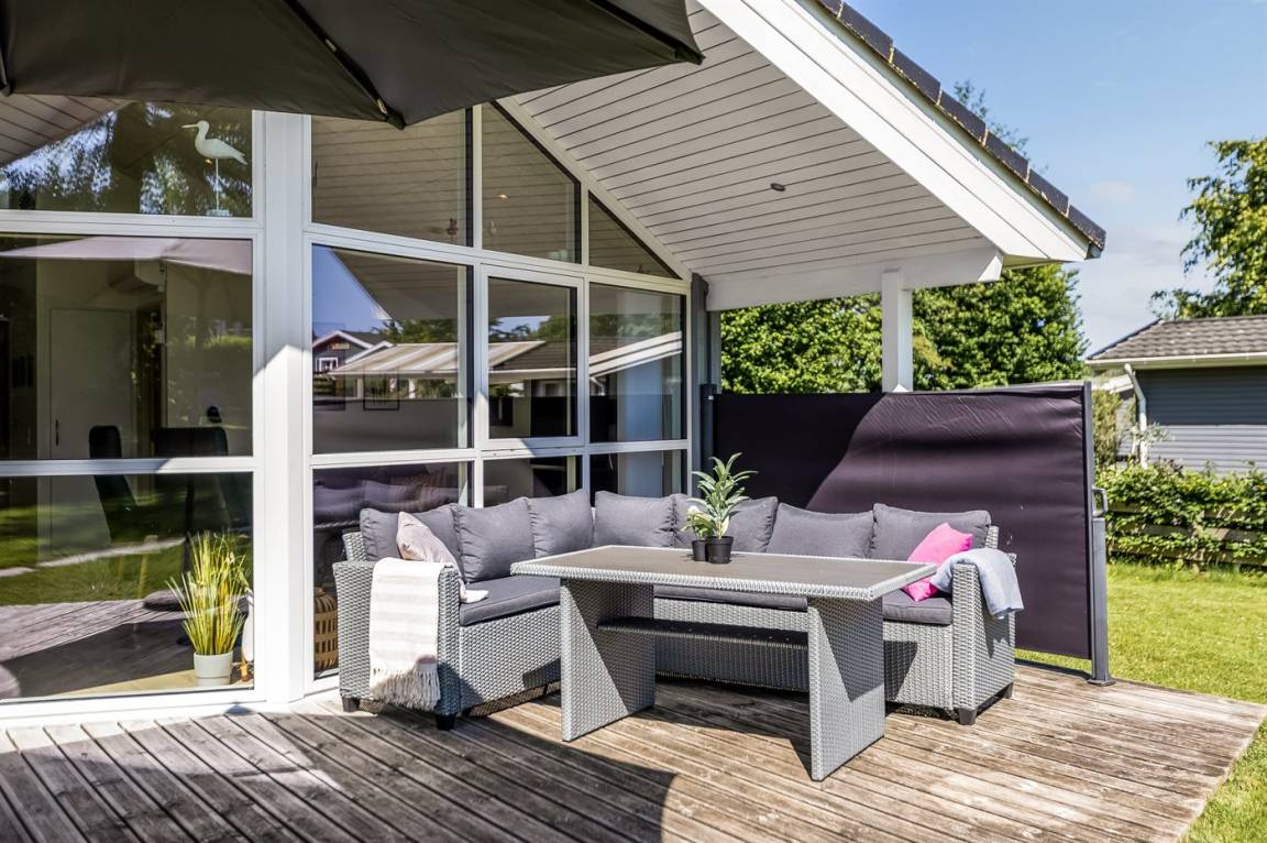 Draußen gibt es sowohl offene Terrassenbereiche als auch eine schöne überdachte Fläche. Auf den Terrassen findet ihr verschiedene Gartenmöbel, unter anderem ein Loungeset und Sonnenliegen – ideal für einen entspannten Tag mit einem guten Buch in der Sonne oder im Schatten.