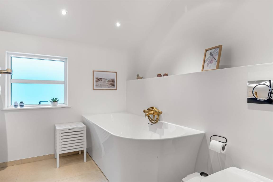 Das Ferienhaus verfügt über drei separate Schlafzimmer mit komfortablen Doppelbetten – ideal für die ganze Familie oder mehrere Paare. Das Badezimmer bietet zusätzlichen Komfort in Form von einer Badewanne an, in der du nach einem erlebnisreichen Tag entspannen kannst.