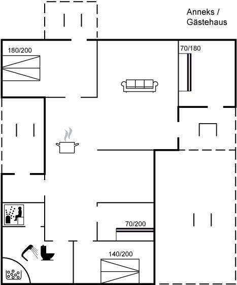 SchlafverhältnisseDie Schlafplätze verteilen sich auf 3 Schlafräume. 4 Schlafplätze in Doppelbetten. 3 Schlafplätze in Etagenbetten. 1 von diesen Schlafplätzen befindet sich im Gästehaus. Ferner steht ein Kinderbett zur Verfügung.
