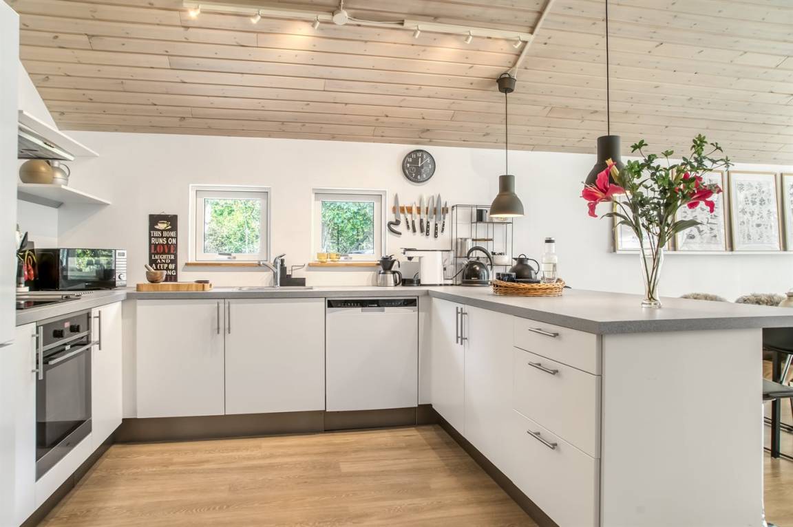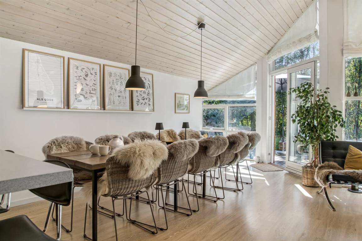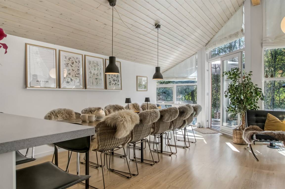 DraußenDie Ferienunterkunft liegt auf einem 3062 m² großen Gartengrundstück. Die Entfernung zum Meer beträgt 1190 m. Die Entfernung zum Fjord beträgt 340 m. Die nächste Einkaufsmöglichkeit liegt 6500 m entfernt. In einem Abstand von 15000 m gibt es einen Golfplatz. Es steht ein offenes Terrassenareal zur Verfügung. Außerdem gibt es überdachte Terrasse. Schaukel. Trampolin. Spielturm. Rutsche. Fußballtor.Lagerfeuerstelle. Es steht ein Grill zur Verfügung. Parkplatz auf dem Grundstück.