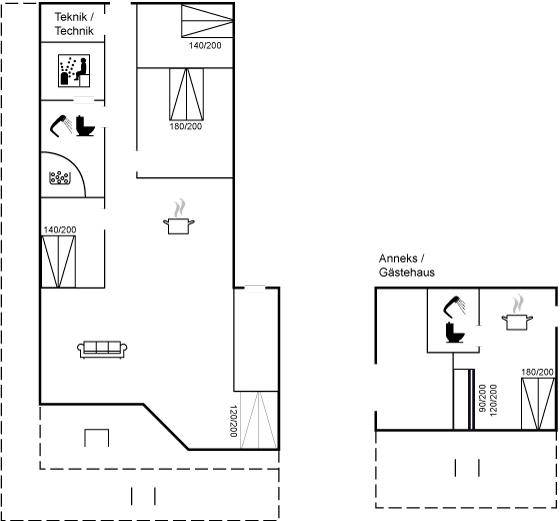 SchlafverhältnisseDie Schlafplätze verteilen sich auf 4 Schlafräume. 8 Schlafplätze in Doppelbetten. 2 Schlafplätze in einem Etagenbett.1 Schlafplatz im Alkoven. 1 von diesen Schlafplätzen befindet sich im Wohnzimmer, und 2 Schlafplätzen befinden sich im Gästehaus. Ferner steht ein Kinderbett zur Verfügung.