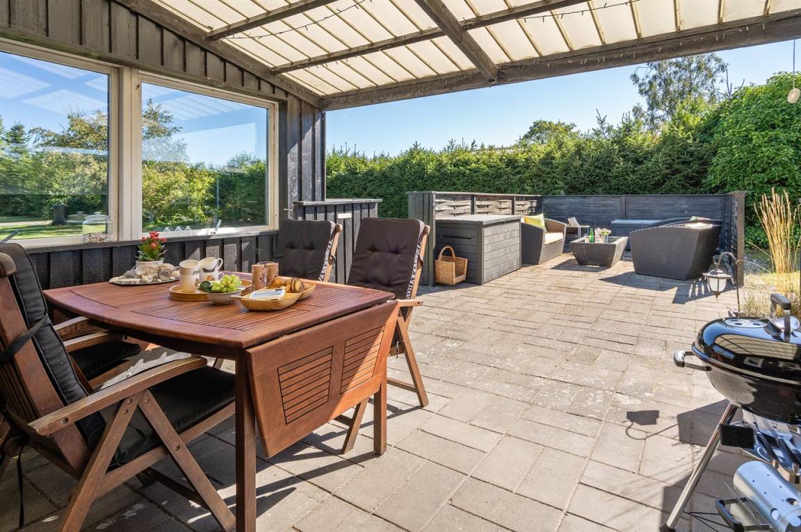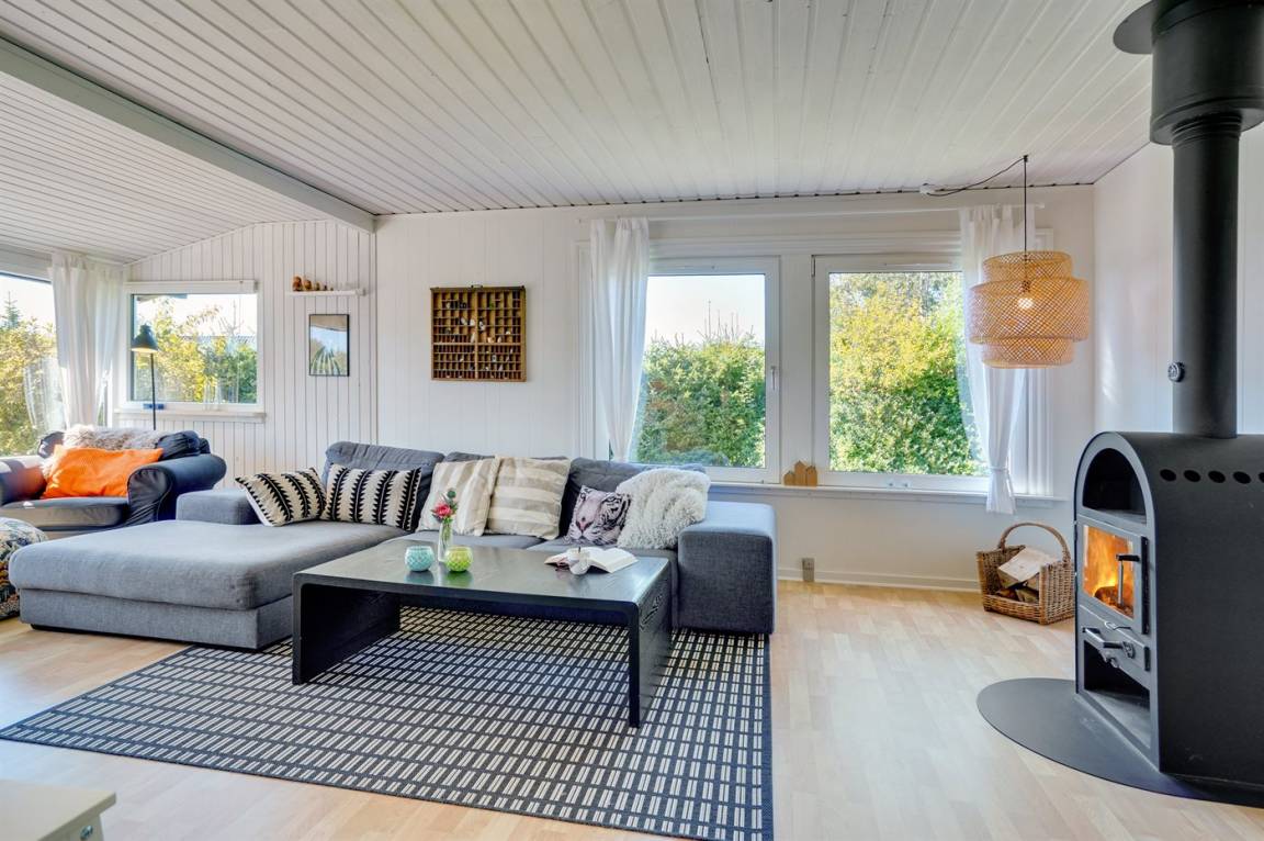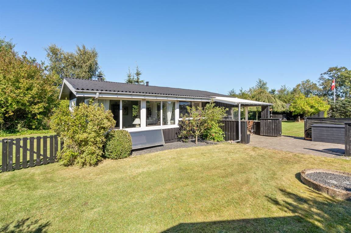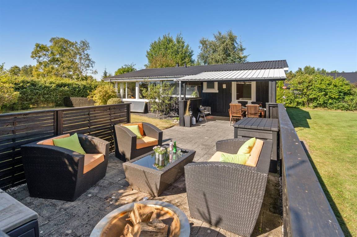 DraußenDie Ferienunterkunft liegt auf einem 945 m² großen Naturgrundstück. Das Grundstück ist eingezäunt. Die Entfernung zum Meer beträgt 640 m. Die Entfernung zum Fjord beträgt 12380 m. Die nächste Einkaufsmöglichkeit liegt 1290 m entfernt. In einem Abstand von 15150 m gibt es einen Golfplatz. Es steht ein offenes Terrassenareal zur Verfügung. Außerdem gibt es überdachte Terrasse. Parkplatz auf dem Grundstück.