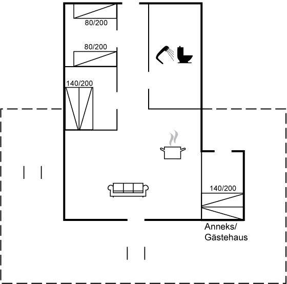 SchlafverhältnisseDie Schlafplätze verteilen sich auf 3 Schlafräume. 4 Schlafplätze in Doppelbetten. 2 Schlafplätze in Einzelbetten. 2 von diesen Schlafplätzen befinden sich im Gästehaus.