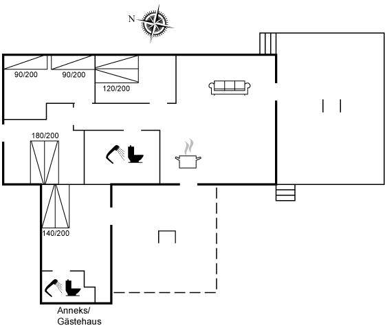 DraußenDie Ferienunterkunft liegt auf einem 967 m² großen Naturgrundstück. Die Entfernung zum Meer beträgt 340 m. Die nächste Einkaufsmöglichkeit liegt 570 m entfernt. Es steht ein 15 m² Terrassenareal zur Verfügung. Außerdem gibt es 10 m² überdachte Terrasse. Geräteraum. Schaukel. Sandkasten. Es steht ein Grill zur Verfügung. Parkplatz auf dem Grundstück.