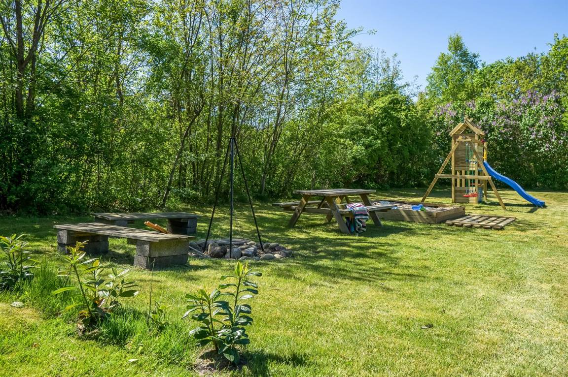 Im Garten gibt es eine gemütliche Sitzecke mit Lagerfeuerstelle und Tisch-Bank-Garnitur, sowie eine Spielecke mit großem Sandkasten, einem Spielturm mit Schaukeln, einer Rutsche und verschiedenen Spielmöglichkeiten.
