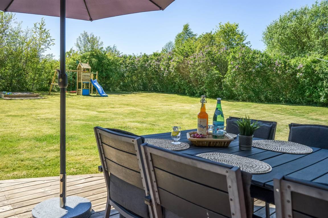 Auf der großen Terrasse am Haus gibt es einen Esstisch, eine Kaffeeecke, eine Lounge-Ecke, Liegestühle und einen Sonnenschirm. Es besteht auch die Möglichkeit, den Grill aus der Garage zu holen