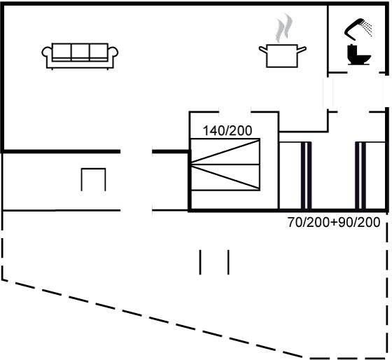 Die Schlafplätze verteilen sich auf 2 Zimmer: 1 mit Doppelbett und 1 mit 2 Etagenbetten. Badezimmer mit Duschnische und Toilette.