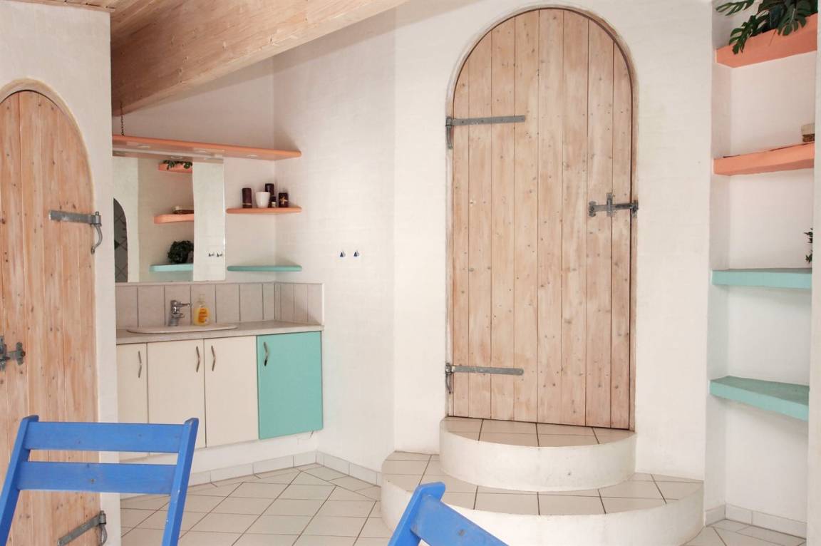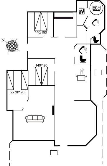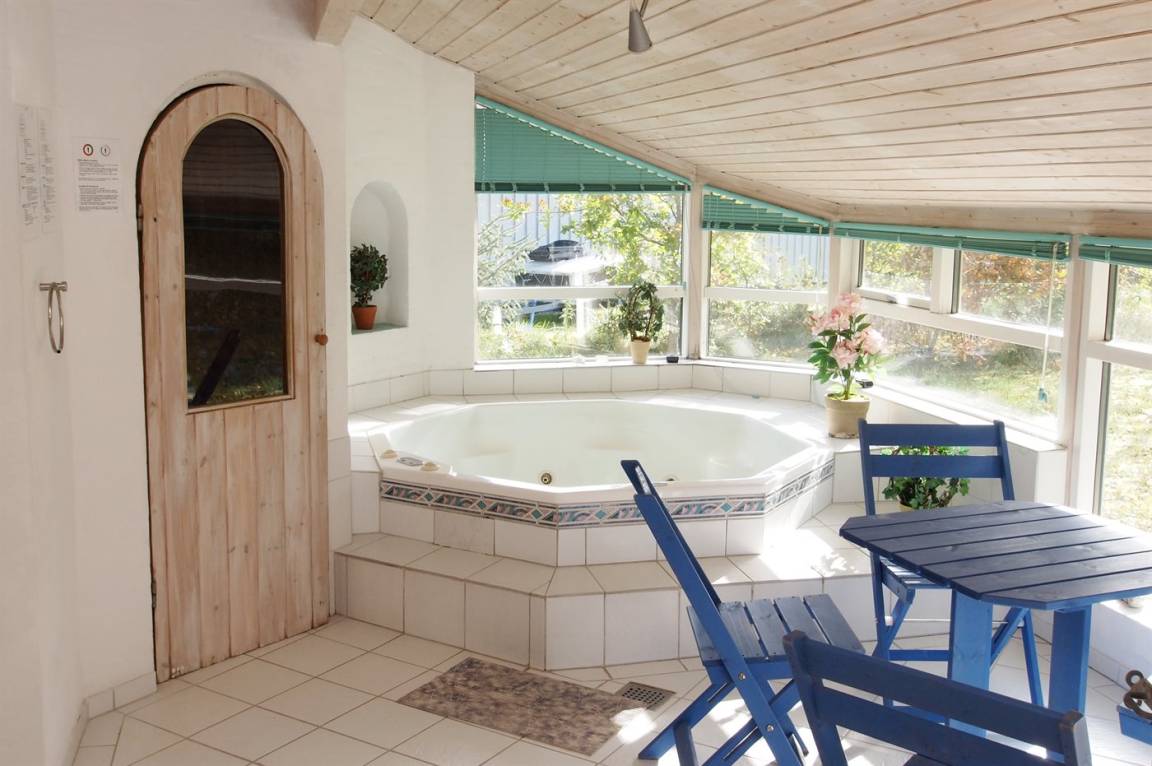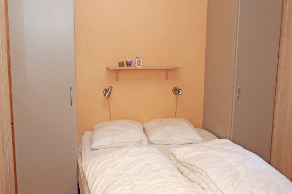 Die Schlafplätze verteilen sich auf 2 Schlafzimmer mit Doppelbett, 1 Zimmer mit Etagenbett und 1 Zimmer mit 2 Einzelbetten. Das Zimmer mit Einzelbetten liegt in Verbindung mit dem Wohnzimmer. Großes, schönes Badezimmer in versetzter Ebene mit Fußbodenheizung, separater Toilette, Duschnische, direktem Zugang zur Sauna und einem schönen, 8-Pers. Whirlpool (Standwasser) sowie einem gemütlichen Ecke mit Tisch und Stühlen. Noch ein Badezimmer mit Duschnische, Waschmaschine und Wäschetrockner.