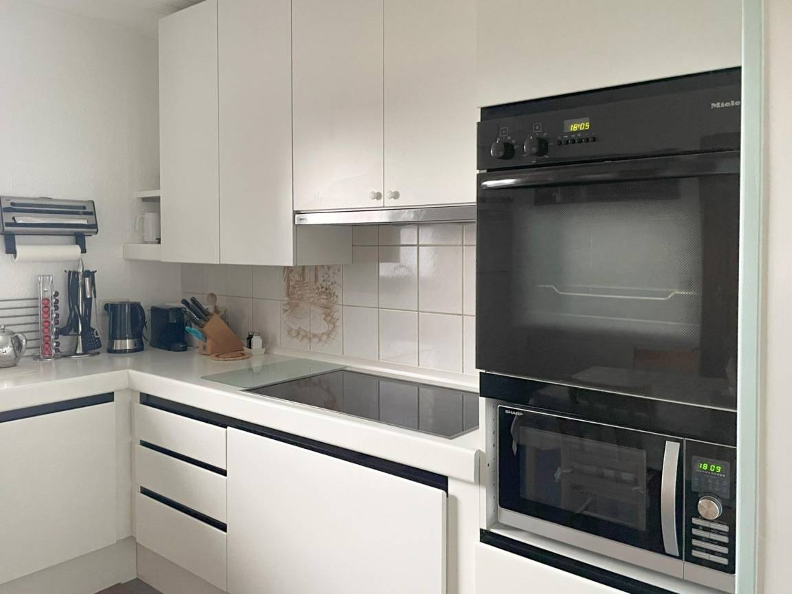In der 1. Etage: Eingang, Küche mit Wasserkocher, Toaster, Kochherd(4 Kochplatten, Ceranfeld), Dunstabzugshaube, Kaffeemaschine(Espresso, Filter, Bohnen, nespresso cups), Backofen(Heißluftheizung, Grillofen), Kombi-Mikrowelle, Geschirrspüler, Kühl-/Gefrierkombination, Zitruspresse , Wohn/Esszimmer mit TV, Esstisch, Sitzecke, DVD-Player, Radio
