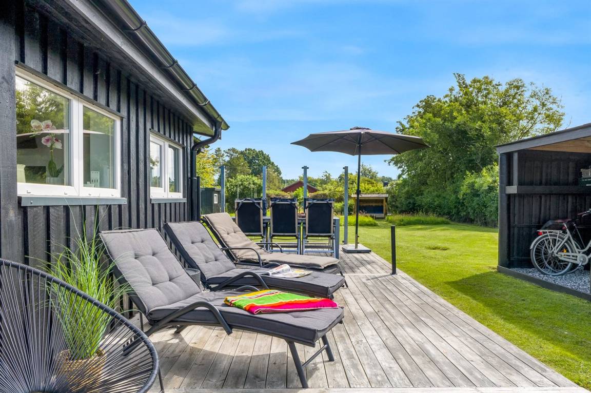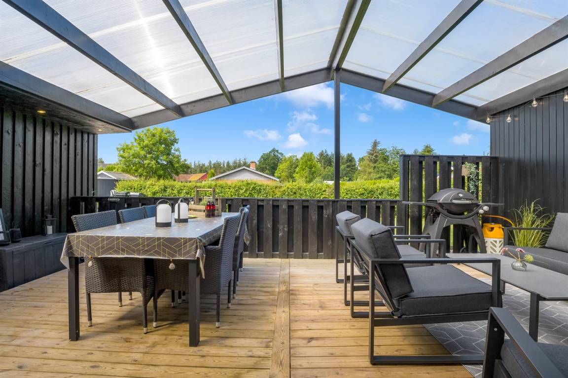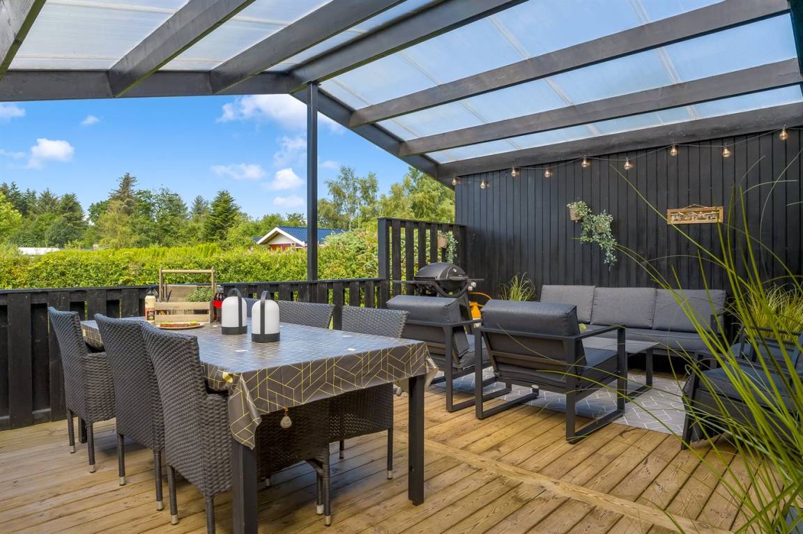 Gemütliches und einladendes Ferienhaus mit einer fantastischen und charmanten überdachten Terrasse, auf der du deinen Urlaub windgeschützt und in Ruhe genießen kannst – ganz egal bei welchem Wetter.