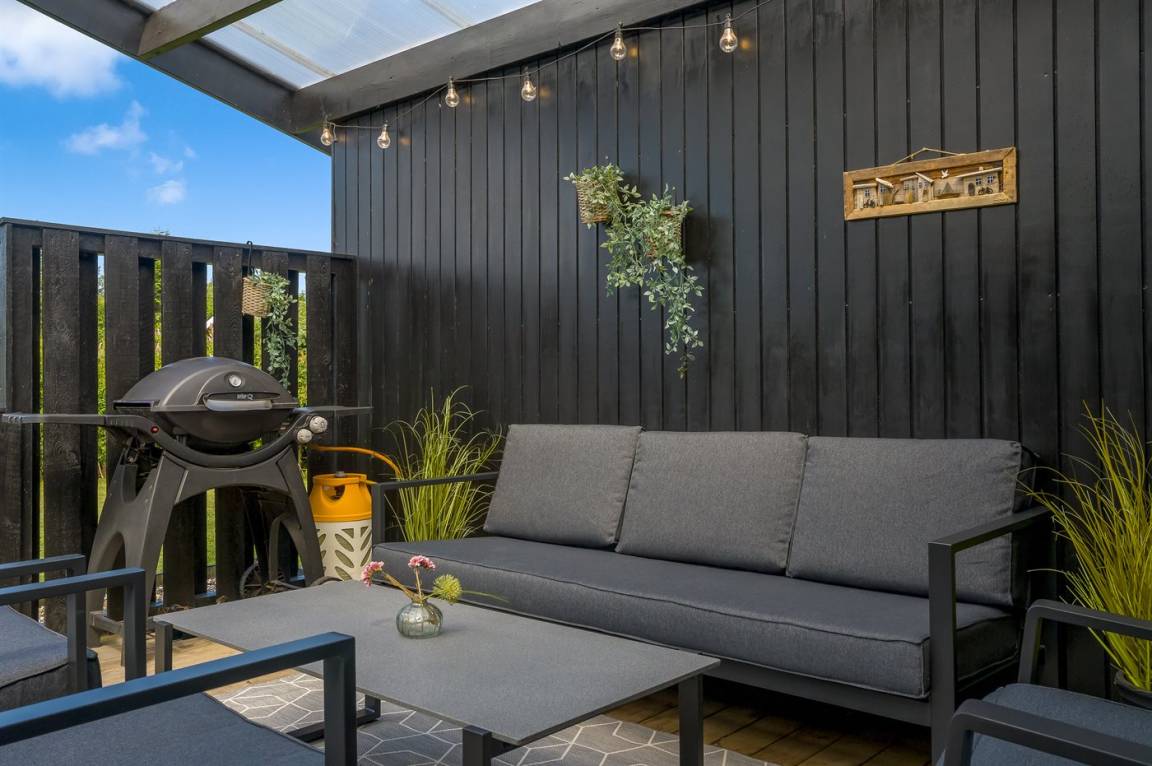 Hinter dem Haus findest du eine große offene Terrasse mit viel Platz zum Entspannen, Sonnenbaden oder für gemütliche Abendessen. Im Garten gibt es außerdem sowohl einen Shelter als auch eine Feuerstelle, was dir authentische Erlebnisse unter freiem Himmel ermöglicht.