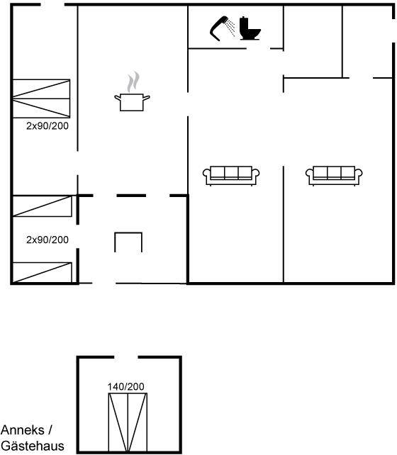 SchlafverhältnisseDie Schlafplätze verteilen sich auf 3 Schlafräume. 4 Schlafplätze in Doppelbetten. 2 Schlafplätze in Einzelbetten. 2 von diesen Schlafplätzen befinden sich im Gästehaus.