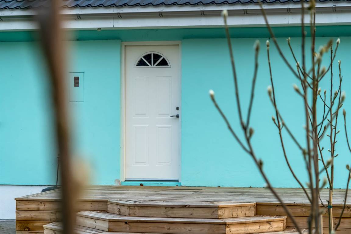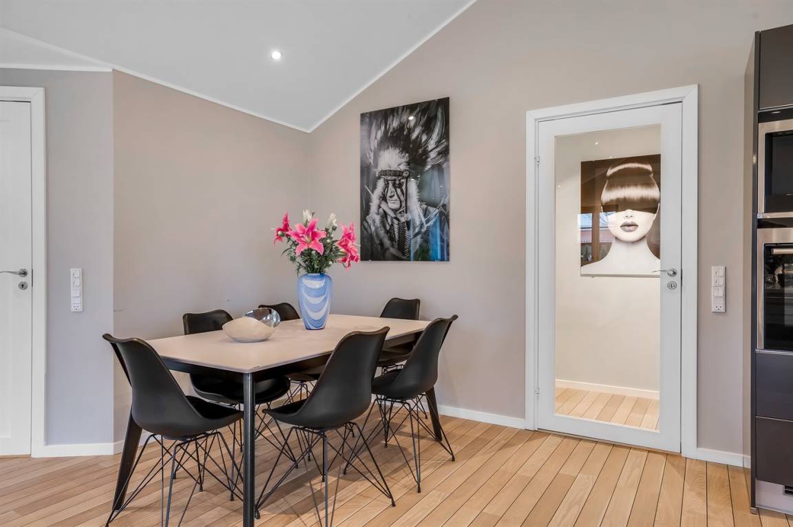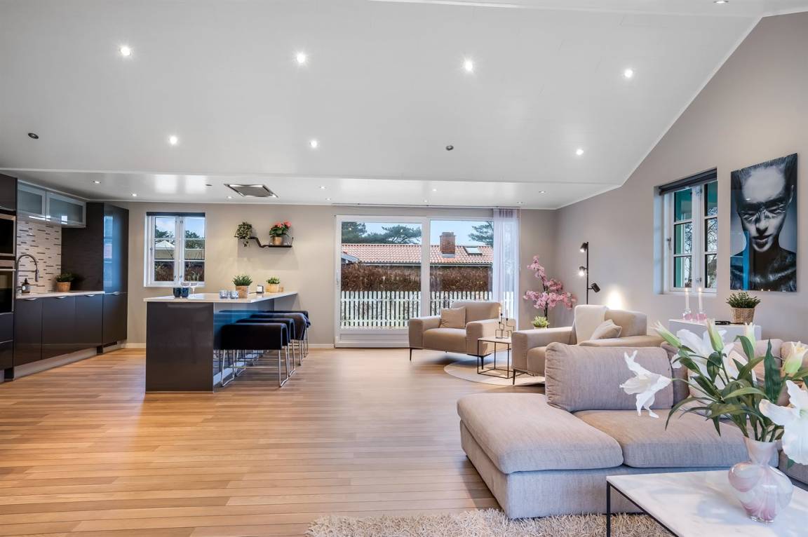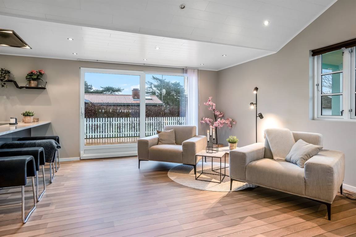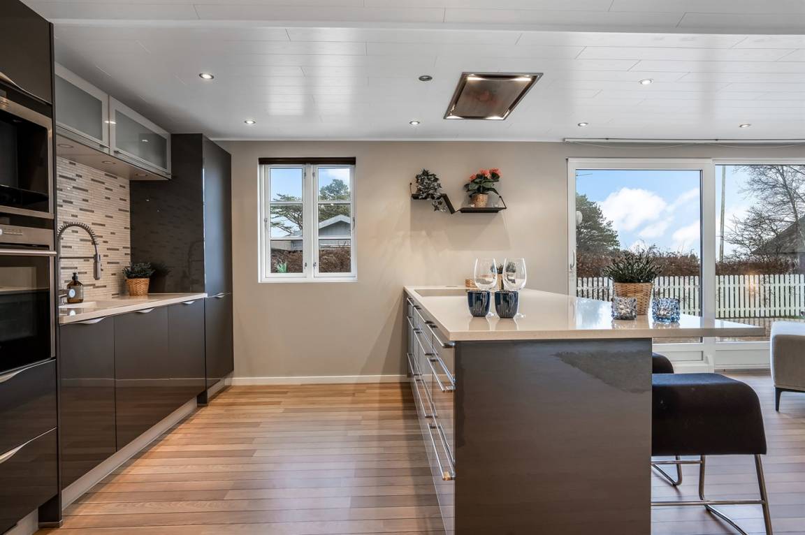 DraußenDie Ferienunterkunft liegt auf einem 1063 m² großen Gartengrundstück. Die Entfernung zum Meer beträgt 300 m. Die Entfernung zum Fjord beträgt 6300 m. Die nächste Einkaufsmöglichkeit liegt 1400 m entfernt. In einem Abstand von 5800 m gibt es einen Golfplatz. Es steht ein offenes Terrassenareal zur Verfügung. Außerdem gibt es überdachte Terrasse. Es steht ein Grill zur Verfügung. Parkplatz auf dem Grundstück.