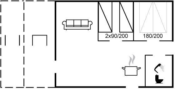 SchlafverhältnisseDie Schlafplätze verteilen sich auf 2 Schlafräume. 2 Schlafplätze in einem Doppelbett. 2 Schlafplätze in Einzelbetten.