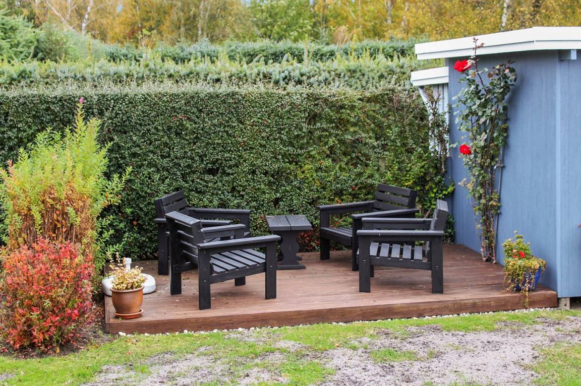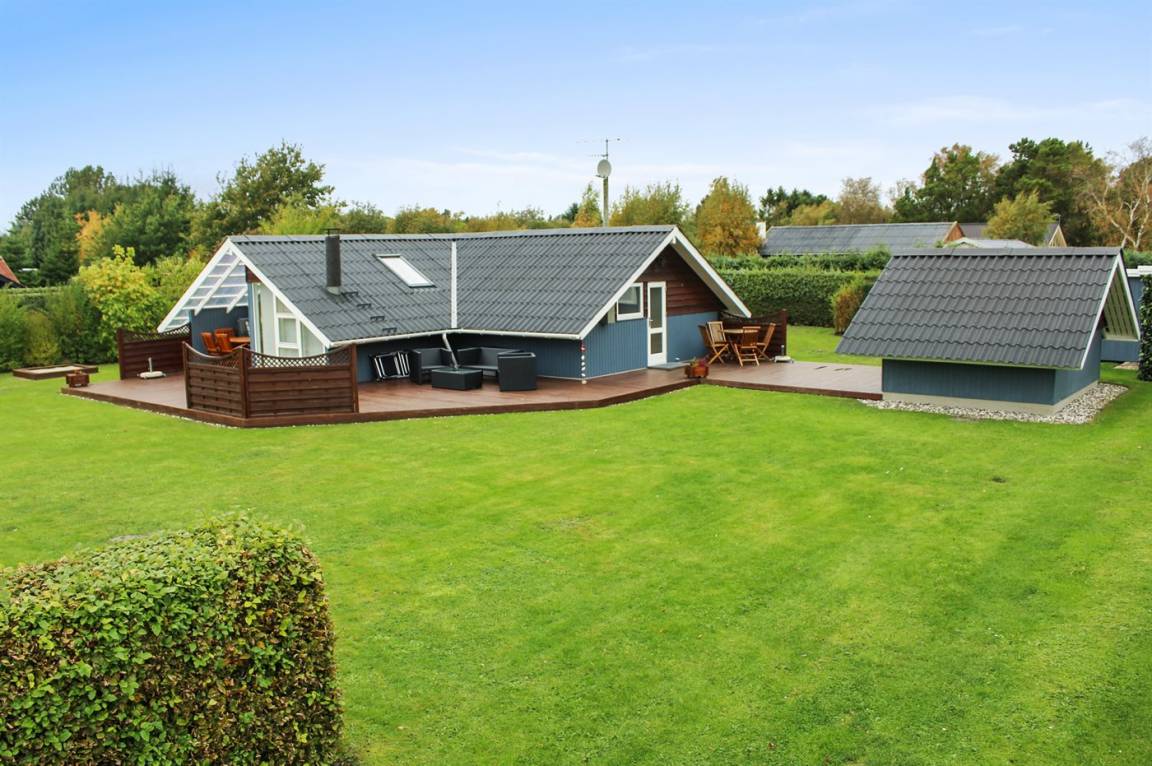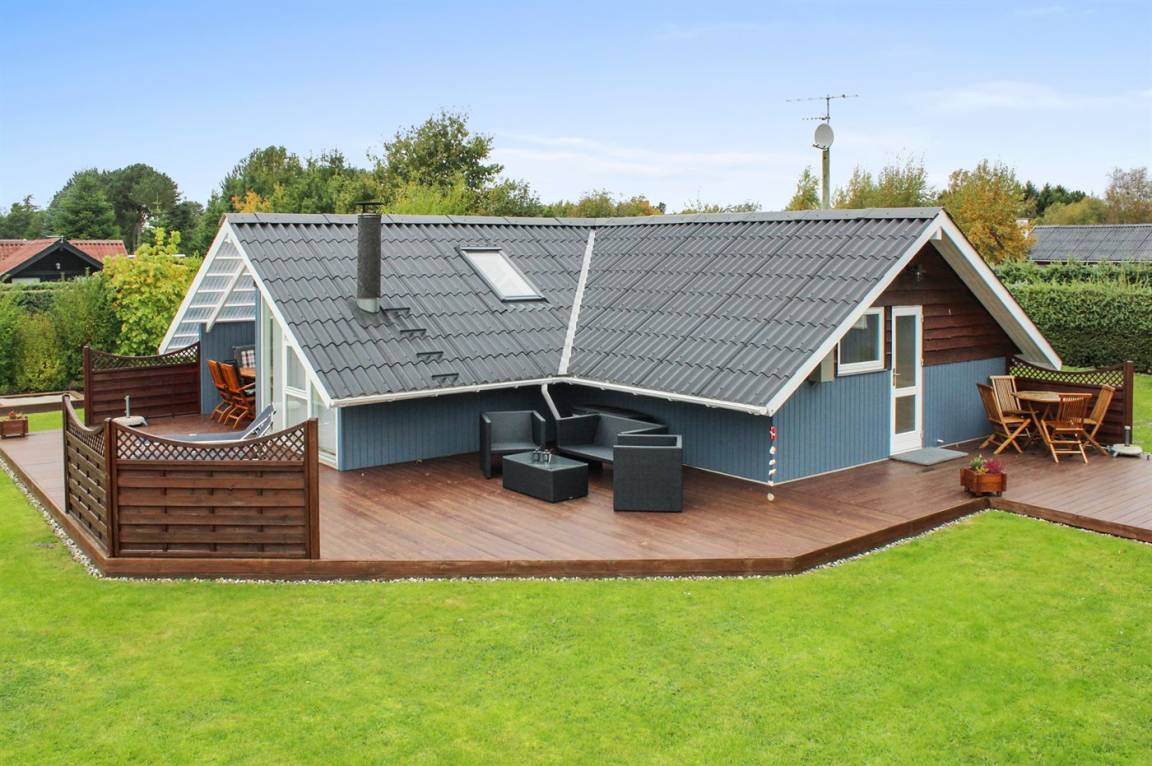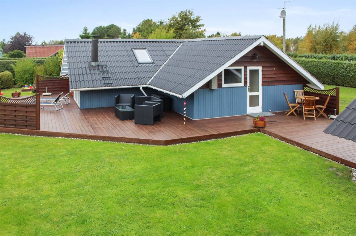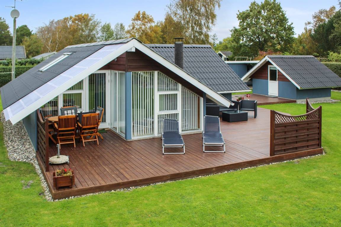 Ein schönes Sommerhaus mit ein Anbau, grosser, teilweiser überdachter Terrasse. Ausgestattet mit Gartenmöbeln und Sonnenliegen.