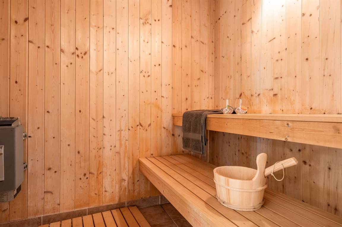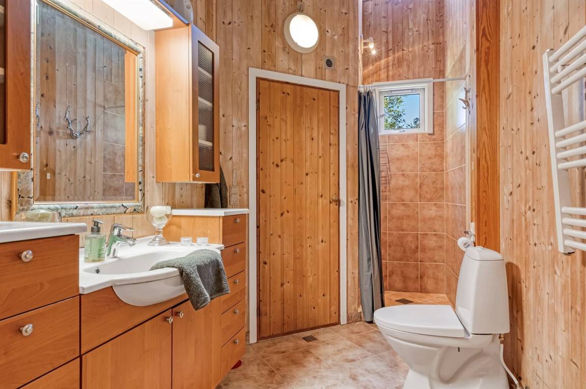 Es gibt ein Badezimmer mit Duschnische, Zugang zur Sauna, Toilette und Fußbodenheizung sowie eine Gästetoilette.