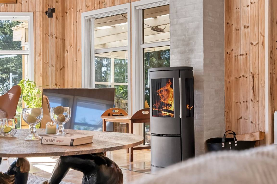 Das Ferienhaus verfügt über WLAN und einen Fernseher mit Chromecast. Das Wohnzimmer ist mit einem gemütlichen Kaminofen ausgestattet.