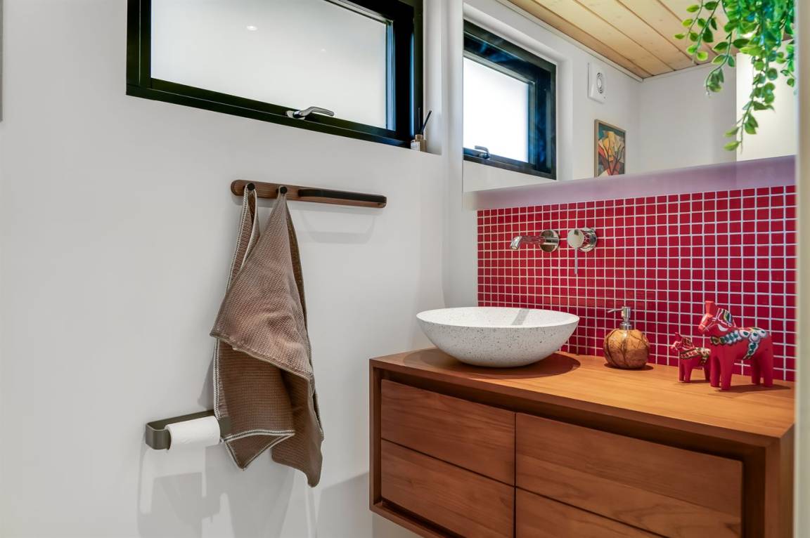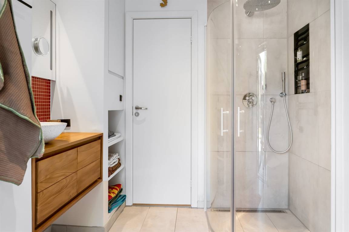 Es gibt 1 Badezimmer mit Fußbodenheizung, Duschnische und Toilette sowie 1 Gästetoilette ebenfalls mit Fußbodenheizung.