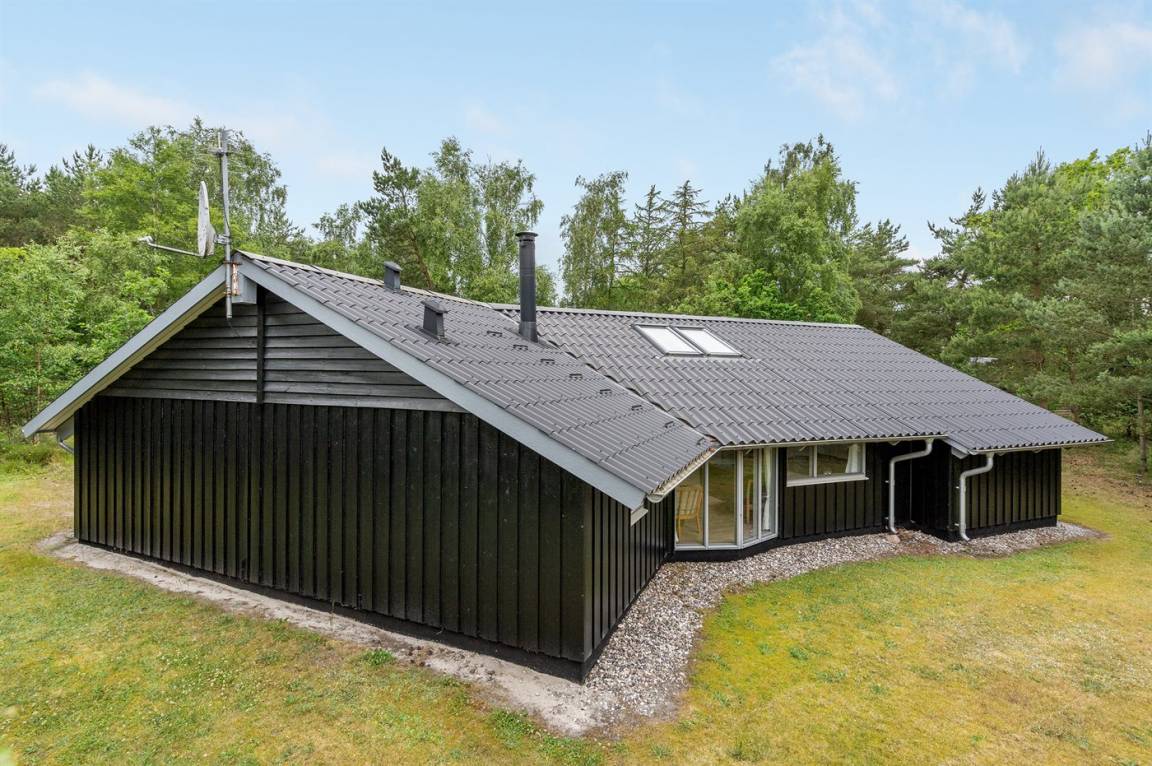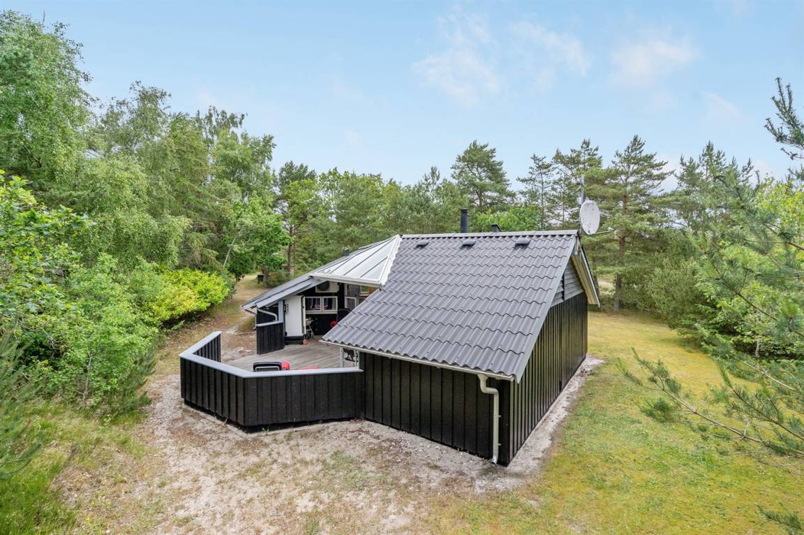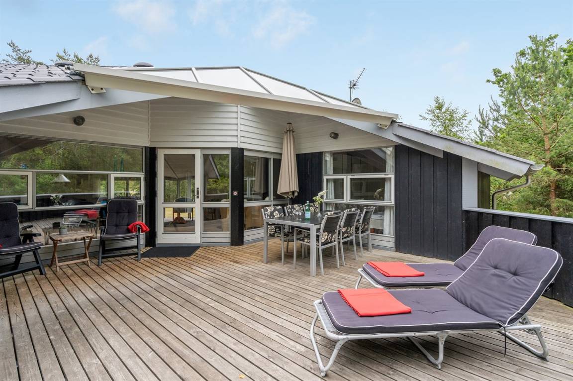 Grosses Ferienhaus in Holz. Grosse, ungestörte Terrasse mit Gartenmöbeln und Sonnenliegen. Das Grundstück ist gross und liegt nah an einem Naturschützgebiet. Kostenloses Brennholz.