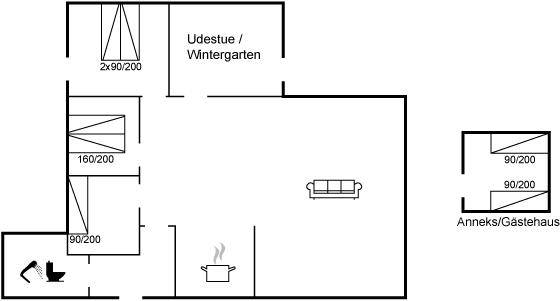 EinrichtungDas Ferienhaus eignet sich für 7 Personen. Die Ferienunterkunft hat eine Wohnfläche von 118 m² und wurde 1969 gebaut. 1993 wurde die Ferienunterkunft renoviert. Haustiere dürfen nicht mitgebracht werden. Die Ferienunterkunft ist mit einer energiefreundlichen Luft-Luft-Wärmepumpe ausgestattet. Die Ferienunterkunft ist mit Waschmaschine ausgestattet. Wäschetrockner. Tiefkühlmöglichkeit mit 60 Liter Nutzinhalt. Es gibt außerdem einen Kaminofen. Für die jüngsten Feriengäste ist 1 Kinderhochstuhl vorhanden.