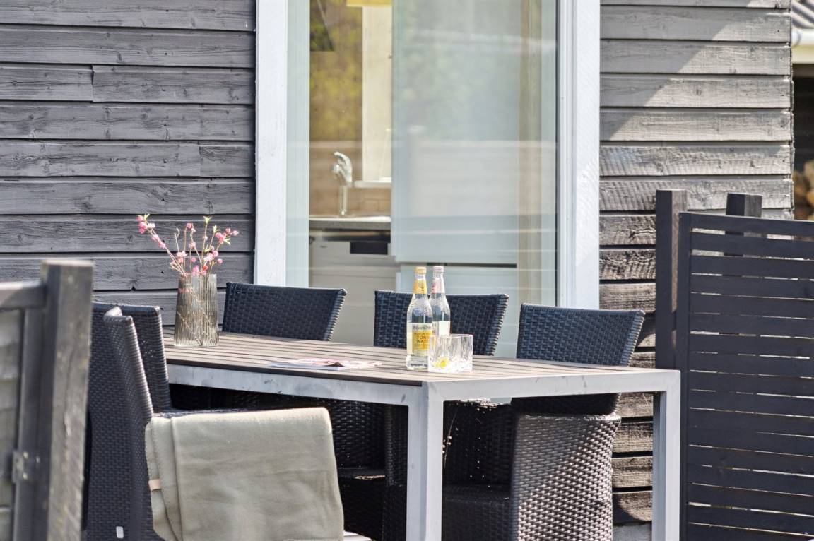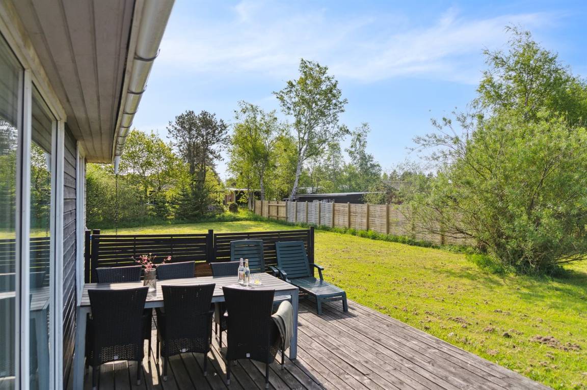 Gemütliches Ferienhaus in Holz. Das Grundstück ist mit Rasen und das Haus hat eine schöne Terrasse, mit Gartenmöbeln und Grill.
